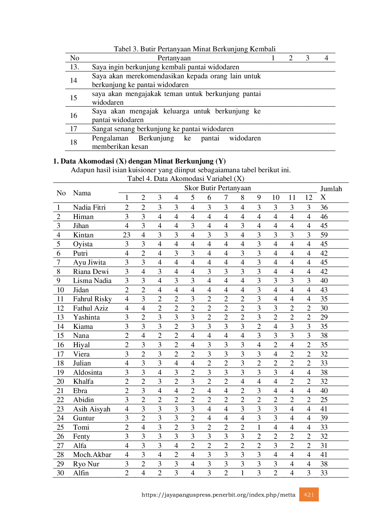 Metta : Jurnal Ilmu MultidisiplinMetta : Jurnal Ilmu MultidisiplinPenelitian ini bertujuan untuk analisis komprehensif terhadap peran fasilitas akomodasi dalam memengaruhi minat berkunjung wisatawan di Pantai Widodaren. Hasil temuannya tentu akan dijadikan tambahan wawasan yang mendalam tentang cara meningkatkan industri pariwisata di Pantai Widodaren. Penelitian ini merupakan penelitian kuantitatif dengan variabel X adalah akomodasi. Sementara itu, variabel Y adalah minat berkunjung. Populasi dalam analisis data ini adalah semua pengunjung yang mengunjungi objek wisata ini. Teknik pengambilan sampel menggunakan accidental sampling atau convenience sampling yang artinya semua pengunjung atau siapa saja yang peneliti temui saat observasi dijadikan sebagai sampel hingga kriteria minimal terpenuhi, yaitu 30 responden. Hasil dari penelitian ini adalah terdapat hubungan yang positif dan signifikan antara kualitas akomodasi dengan Minat Berkunjung ke Pantai Widodaren. Apabila kualitas akomodasi meningkat, akan meningkatkan pula minat pengunjung ke Pantai Widodaren Yogyakarta. Dengan demikian perlu upaya dari pengelola dan pemerintah setempat untuk meningkatkan fasilitas akomodasi di objek wisata ini.