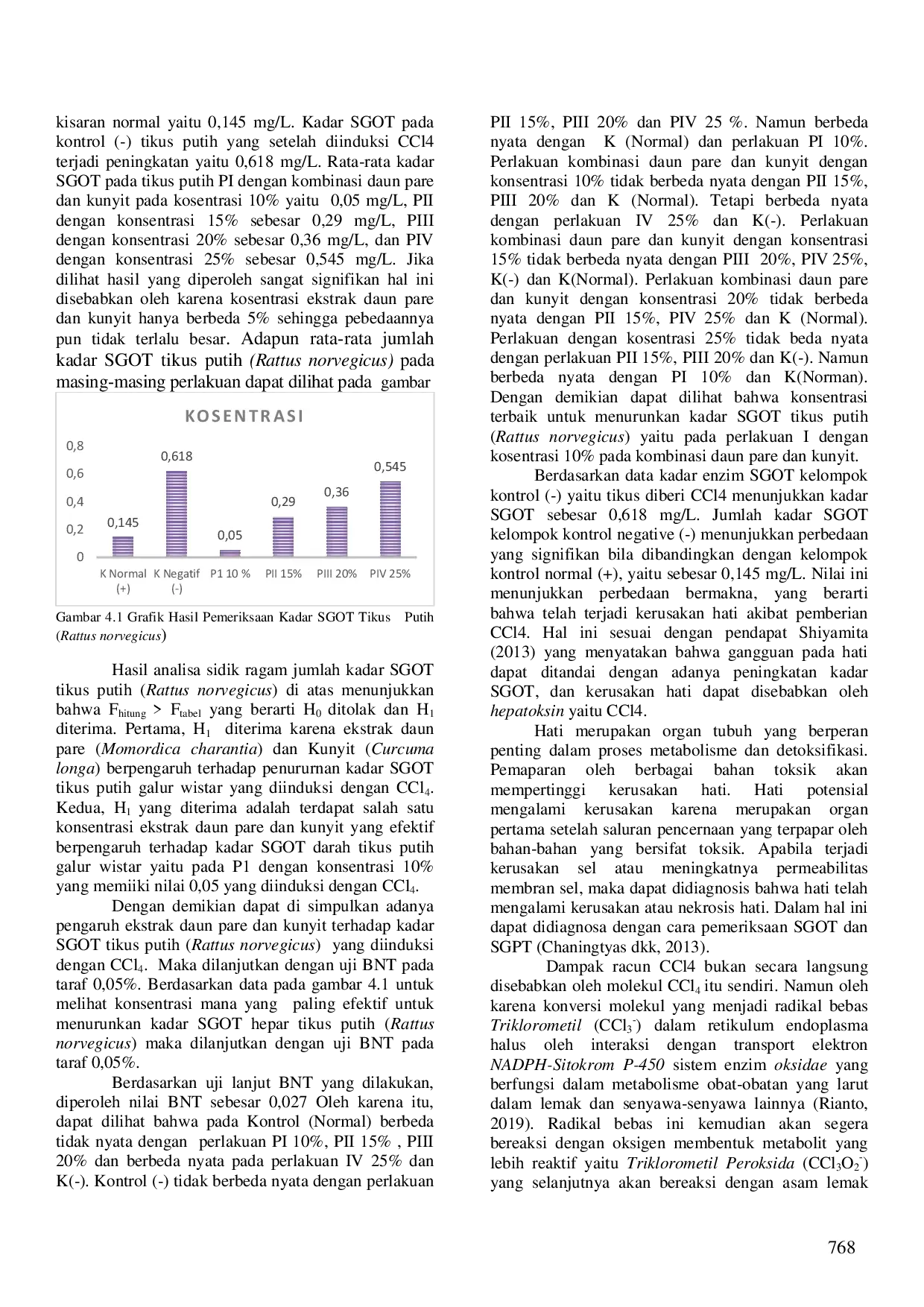 Kombinasi ekstrak daun pare (Momordica charantia) dan kunyit (Curcuma longa) terbukti efektif sebagai hepatoprotektor pada tikus putih galur wistar yang diinduksi CCl4.Konsentrasi yang paling efektif sebagai hepatoprotektor adalah 10% dengan nilai kadar SGOT sebesar 0,05 mg/L.Hasil penelitian ini layak digunakan sebagai media pembelajaran berupa penuntun praktikum dengan tingkat kelayakan rata-rata 67,343%.