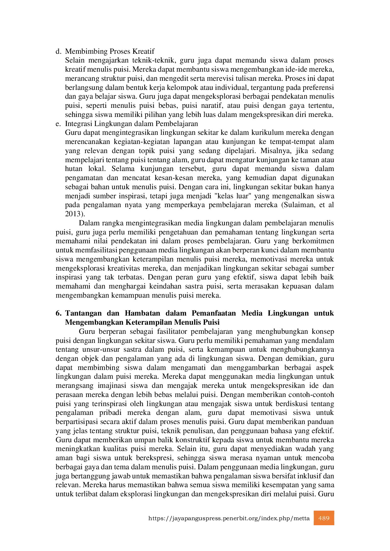 Metta : Jurnal Ilmu MultidisiplinMetta : Jurnal Ilmu MultidisiplinPenggunaan media lingkungan dalam pembelajaran menulis puisi menawarkan solusi untuk meningkatkan minat dan kemampuan siswa dalam menulis puisi. Media lingkungan merujuk pada segala aspek di sekitar siswa yang dapat dijadikan inspirasi atau bahan pembelajaran, seperti keindahan alam, keunikan budaya lokal, hingga fenomena sosial yang terjadi di sekitar mereka. Tujuan penelitian ini adalah untuk mengetahui bagaimana pemanfaatan media lingkungan dalam upaya mengembangkan keterampilan menulis puisi siswa kelas V SD. Penelitian ini merupakan penelitian kualitatif, metode pengumpulan data dalam penelitian ini adalah studi kepustakaan dan observasi. Hasil penelitian menunjukkan bahwa Pemanfaatan media lingkungan dalam mengajar menulis puisi di SD sangat penting. Alam, budaya lokal, dan kehidupan sosial sekitar sekolah terbukti efektif dalam menjadi sumber inspirasi yang kaya. Media ini telah terbukti efektif dalam mengembangkan keterampilan menulis puisi siswa, meningkatkan kosakata, ekspresi emosional, dan pemahaman kultural serta sosial. Namun, ada tantangan seperti keterbatasan sumber daya, kurikulum yang kaku, dan variasi perhatian siswa. Pendekatan holistik diperlukan, menggabungkan akademis dengan sensitivitas lingkungan dan budaya. Kolaborasi antara sekolah, guru, siswa, orang tua, dan komunitas diperlukan untuk mengatasi hambatan ini, dengan strategi kreatif untuk mengintegrasikan media lingkungan dalam proses belajar secara efektif.