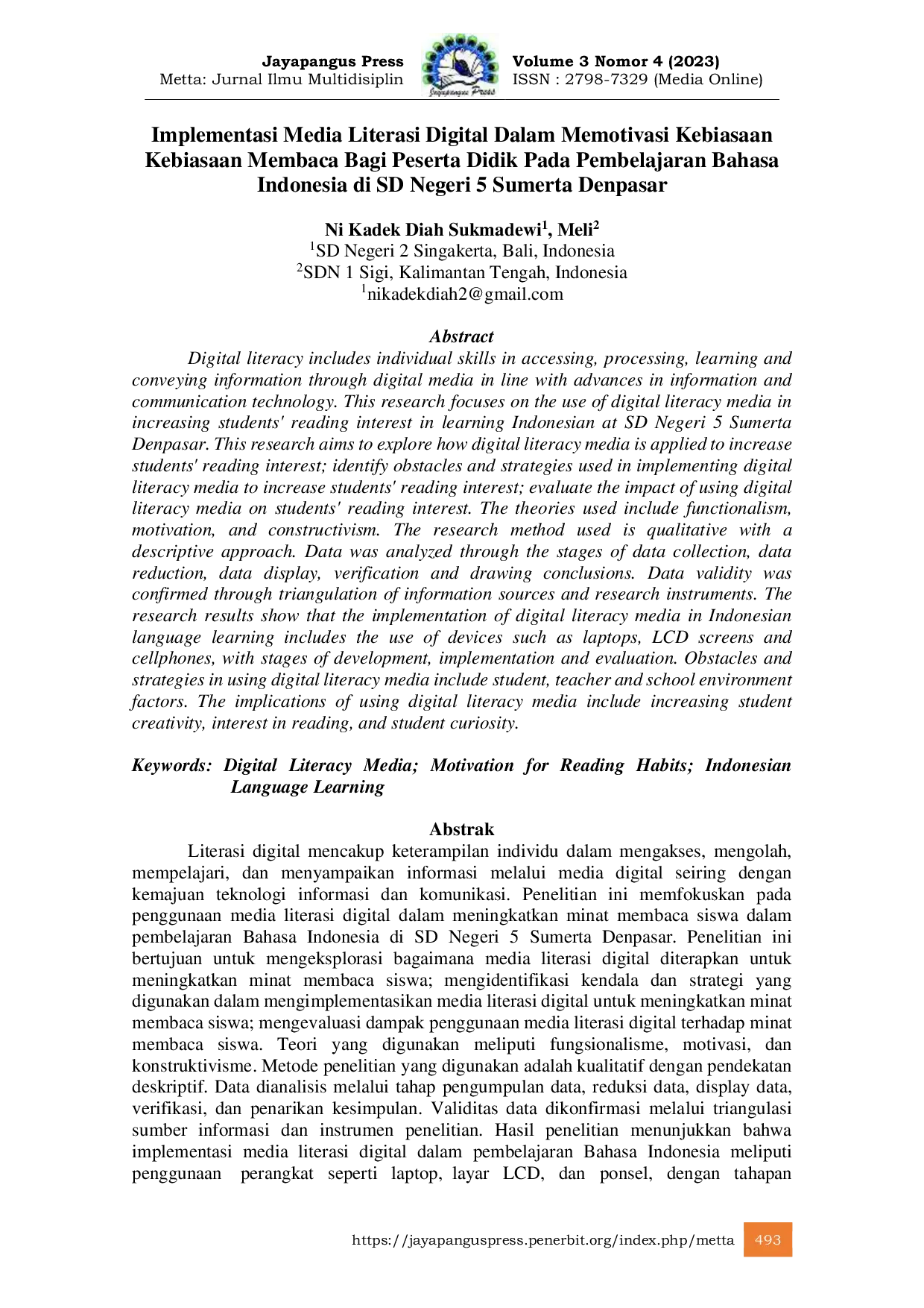 Metta : Jurnal Ilmu MultidisiplinMetta : Jurnal Ilmu MultidisiplinLiterasi digital mencakup keterampilan individu dalam mengakses, mengolah, mempelajari, dan menyampaikan informasi melalui media digital seiring dengan kemajuan teknologi informasi dan komunikasi. Penelitian ini memfokuskan pada penggunaan media literasi digital dalam meningkatkan minat membaca siswa dalam pembelajaran Bahasa Indonesia di SD Negeri 5 Sumerta Denpasar. Penelitian ini bertujuan untuk mengeksplorasi bagaimana media literasi digital diterapkan untuk meningkatkan minat membaca siswa; mengidentifikasi kendala dan strategi yang digunakan dalam mengimplementasikan media literasi digital untuk meningkatkan minat membaca siswa; mengevaluasi dampak penggunaan media literasi digital terhadap minat membaca siswa. Teori yang digunakan meliputi fungsionalisme, motivasi, dan konstruktivisme. Metode penelitian yang digunakan adalah kualitatif dengan pendekatan deskriptif. Data dianalisis melalui tahap pengumpulan data, reduksi data, display data, verifikasi, dan penarikan kesimpulan. Validitas data dikonfirmasi melalui triangulasi sumber informasi dan instrumen penelitian. Hasil penelitian menunjukkan bahwa implementasi media literasi digital dalam pembelajaran Bahasa Indonesia meliputi penggunaan perangkat seperti laptop, layar LCD, dan ponsel, dengan tahapan pengembangan, penerapan, dan evaluasi. Kendala dan strategi dalam penggunaan media literasi digital meliputi faktor siswa, guru, dan lingkungan sekolah. Implikasi dari penggunaan media literasi digital termasuk meningkatnya kreativitas siswa, minat membaca, dan keingintahuan siswa.
