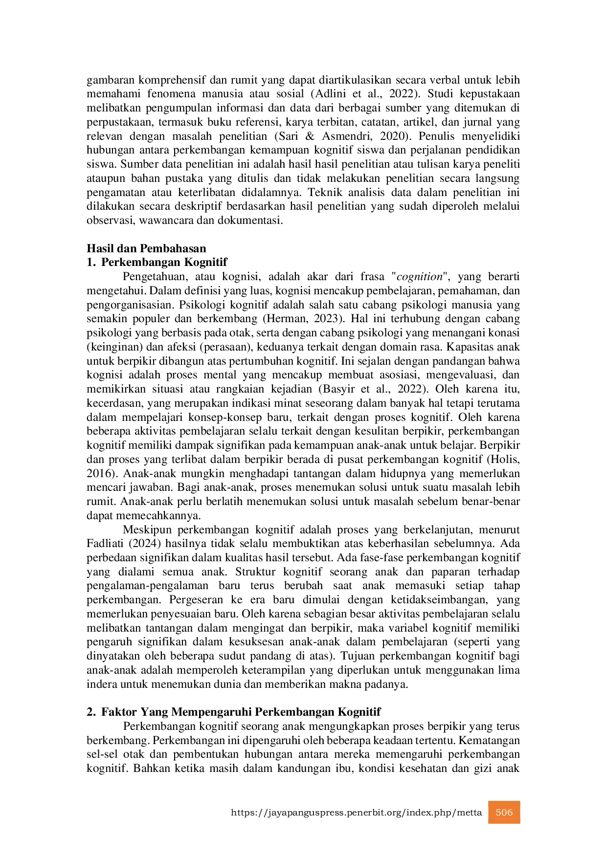 Metta : Jurnal Ilmu MultidisiplinMetta : Jurnal Ilmu MultidisiplinPerkembangan kognitif pada peserta didik akhir-akhir ini sangat menjadi sorotan dikalangan lembaga pendidikan. Perkembangan kognitif atau pengetahuan ini mampu mempengaruhi tingkat kualitas sumber daya manusia yang bisa memberikan dampak untuk kemajuan suatu negara. Jika berbicara mengenai perkembangan kognitif peserta didik, tentu merupakan bagian dari psikologi belajar. Adapun tujuan penelitian ini dimaksudkan untuk mengetahui hubungan kognitif peserta didik dengan proses belajar. Penelitian ini menggunakan jenis penelitian kualitatif dengan studi kepustakaan. Teknik analisis data dalam penelitian ini dilakukan secara deskriptif berdasarkan hasil penelitian yang sudah diperoleh melalui observasi, wawancara dan dokumentasi. Hasil penelitian ini menunjukkan bahwa antara perkembangan kognitif dengan proses belajar saling memiliki keterkaitan satu dengan yang lainnya. Proses pembelajaran dapat dikatakan berhasil jika peserta didiknya sudah mampu memahami dan meresapi ilmu pengetahuan yang kemudian dapat diterapkan oleh peserta didik. Perkembangan kognitif sangatlah penting dalam proses pembelajaran peserta didik, dengan mempertimbangkan keberhasilan pengembangan ranah kognitif dapat memberikan dampak positif terhadap proses perkembangan afektif dan psikomotor. Oleh karena itu, sangat penting bagi pendidik untuk bekerja pada kemampuan kognitif siswa serta mengembangkan keterampilan dasar untuk pembelajaran aktif, yang pada akhirnya mendorong perkembangan dalam domain psikologis lainnya pada siswa.