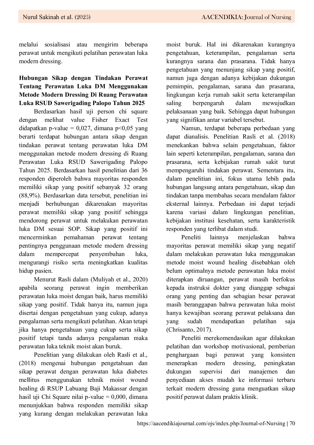 Mayoritas perawat di ruang perawatan luka RSUD Sawerigading Palopo memiliki pengetahuan yang baik dan sikap positif terhadap perawatan luka diabetes melitus menggunakan metode modern dressing.Terdapat hubungan signifikan antara tingkat pengetahuan dan sikap perawat dengan pelaksanaan tindakan perawatan luka.Semakin baik pengetahuan dan sikap perawat, semakin baik pula tindakan keperawatan yang dilakukan sesuai standar.