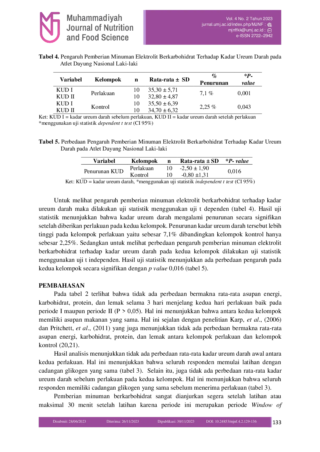 Penelitian ini menunjukkan bahwa pemberian minuman elektrolit berkarbohidrat dengan kandungan karbohidrat 1 gr/kgBB secara signifikan lebih efektif dalam menurunkan kadar ureum darah dibandingkan dengan pemberian 0,35 gr/kgBB.Hasil ini mengindikasikan bahwa konsumsi karbohidrat dalam jumlah yang lebih tinggi setelah latihan dapat membantu mempercepat pemulihan glikogen otot.Dengan demikian, strategi nutrisi ini dapat dipertimbangkan untuk meningkatkan performa atlet dayung.