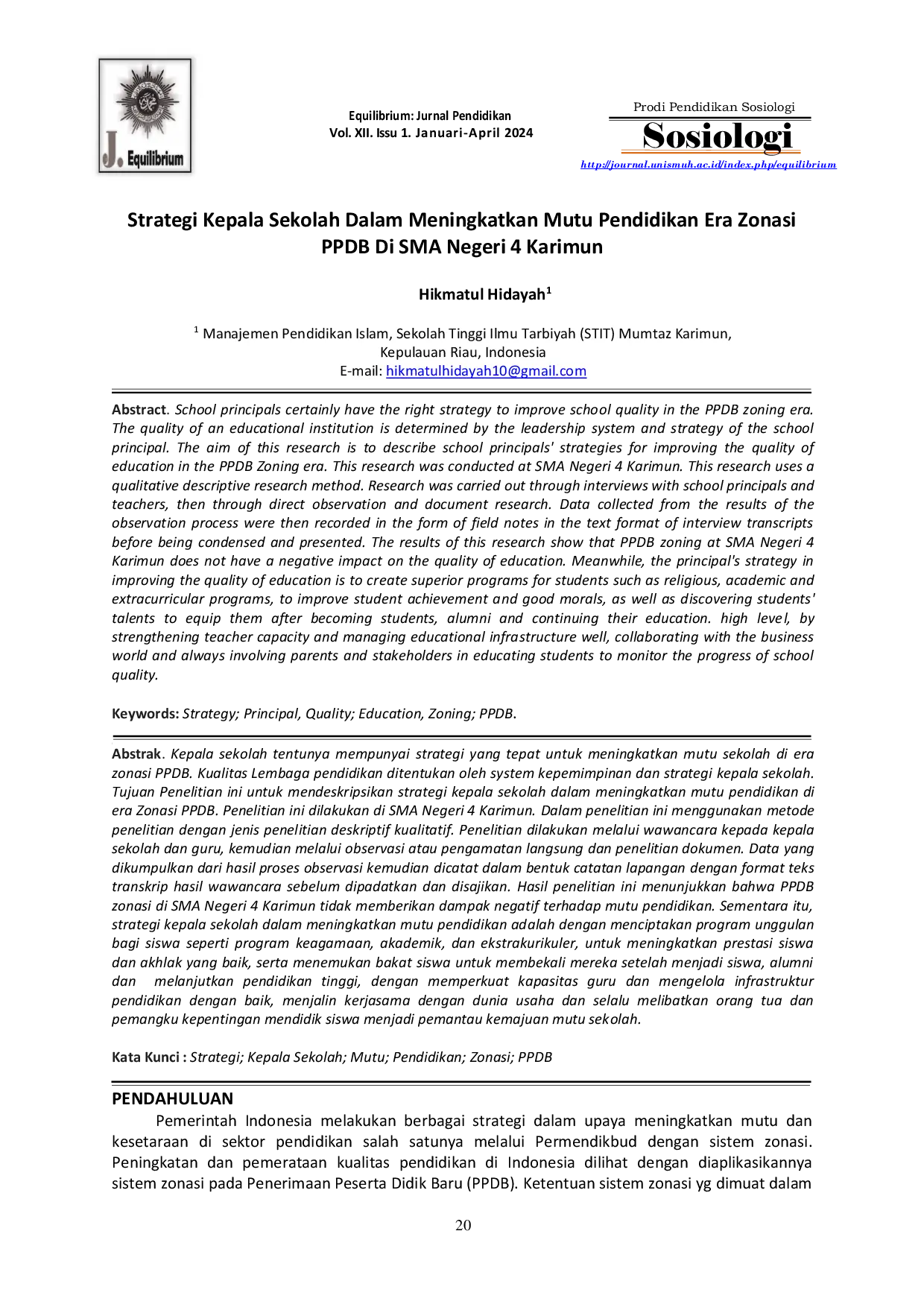 Equilibrium: Jurnal PendidikanEquilibrium: Jurnal PendidikanKepala sekolah tentunya mempunyai strategi yang tepat untuk meningkatkan mutu sekolah di era zonasi PPDB. Kualitas lembaga pendidikan ditentukan oleh system kepemimpinan dan strategi kepala sekolah. Tujuan penelitian ini untuk mendeskripsikan strategi kepala sekolah dalam meningkatkan mutu pendidikan di era Zonasi PPDB. Penelitian ini dilakukan di SMA Negeri 4 Karimun. Dalam penelitian ini menggunakan metode penelitian dengan jenis penelitian deskriptif kualitatif. Penelitian dilakukan melalui wawancara kepada kepala sekolah dan guru, kemudian melalui observasi atau pengamatan langsung dan penelitian dokumen. Data yang dikumpulkan dari hasil proses observasi kemudian dicatat dalam bentuk catatan lapangan dengan format teks transkrip hasil wawancara sebelum dipadatkan dan disajikan. Hasil penelitian ini menunjukkan bahwa PPDB zonasi di SMA Negeri 4 Karimun tidak memberikan dampak negatif terhadap mutu pendidikan. Sementara itu, strategi kepala sekolah dalam meningkatkan mutu pendidikan adalah dengan menciptakan program unggulan bagi siswa seperti program keagamaan, akademik, dan ekstrakurikuler, untuk meningkatkan prestasi siswa dan akhlak yang baik, serta menemukan bakat siswa untuk membekali mereka setelah menjadi siswa, alumni dan melanjutkan pendidikan tinggi, dengan memperkuat kapasitas guru dan mengelola infrastruktur pendidikan dengan baik, menjalin kerjasama dengan dunia usaha dan selalu melibatkan orang tua dan pemangku kepentingan mendidik siswa menjadi pemantau kemajuan mutu sekolah.
