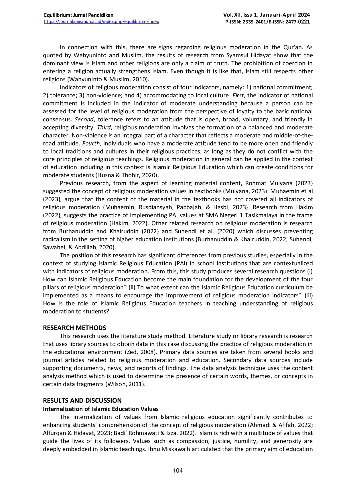 Kesimpulan yang dapat ditarik adalah bahwa Pendidikan Agama Islam dalam meningkatkan moderasi beragama adalah dengan (i) internalisasi nilai-nilai PAI, (ii) partisipasi aktif guru PAI, dan (iii) kurikulum berbasis moderasi beragama.Dari ketiga hal tersebut, PAI dapat menjadi pilar utama dalam meningkatkan indikator moderasi beragama.Batasan penelitian ini adalah masih menggunakan penelitian pustaka sebagai sumber utama.Para peneliti selanjutnya dapat lebih jauh mengkaji Pendidikan Agama Islam dan implikasinya terhadap moderasi beragama secara holistik.