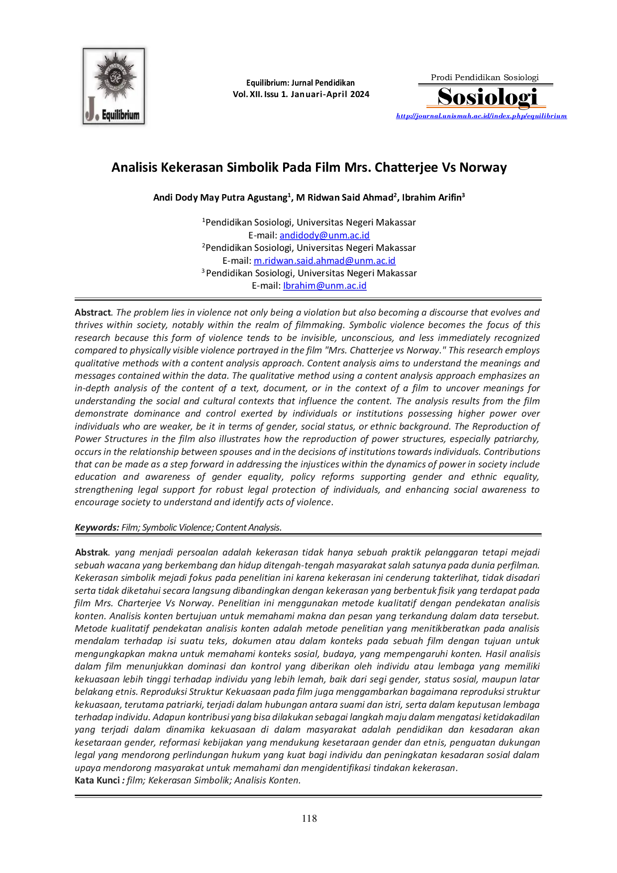 Equilibrium: Jurnal PendidikanEquilibrium: Jurnal PendidikanYang menjadi persoalan adalah kekerasan tidak hanya sebuah praktik pelanggaran tetapi menjadi sebuah wacana yang berkembang dan hidup di tengah-tengah masyarakat, salah satunya pada dunia perfilman. Kekerasan simbolik menjadi fokus pada penelitian ini karena kekerasan ini cenderung tak terlihat, tidak disadari serta tidak diketahui secara langsung dibandingkan dengan kekerasan yang berbentuk fisik yang terdapat pada film Mrs. Chatterjee Vs Norway. Penelitian ini menggunakan metode kualitatif dengan pendekatan analisis konten. Analisis konten bertujuan untuk memahami makna dan pesan yang terkandung dalam data tersebut. Metode kualitatif pendekatan analisis konten adalah metode penelitian yang menitikberatkan pada analisis mendalam terhadap isi suatu teks, dokumen atau dalam konteks pada sebuah film dengan tujuan untuk mengungkapkan makna untuk memahami konteks sosial, budaya, yang mempengaruhi konten. Hasil analisis dalam film menunjukkan dominasi dan kontrol yang diberikan oleh individu atau lembaga yang memiliki kekuasaan lebih tinggi terhadap individu yang lebih lemah, baik dari segi gender, status sosial, maupun latar belakang etnis. Reproduksi Struktur Kekuasaan pada film juga menggambarkan bagaimana reproduksi struktur kekuasaan, terutama patriarki, terjadi dalam hubungan antara suami dan istri, serta dalam keputusan lembaga terhadap individu. Adapun kontribusi yang bisa dilakukan sebagai langkah maju dalam mengatasi ketidakadilan yang terjadi dalam dinamika kekuasaan di dalam masyarakat adalah pendidikan dan kesadaran akan kesetaraan gender, reformasi kebijakan yang mendukung kesetaraan gender dan etnis, penguatan dukungan legal yang mendorong perlindungan hukum yang kuat bagi individu dan peningkatan kesadaran sosial dalam upaya mendorong masyarakat untuk memahami dan mengidentifikasi tindakan kekerasan.