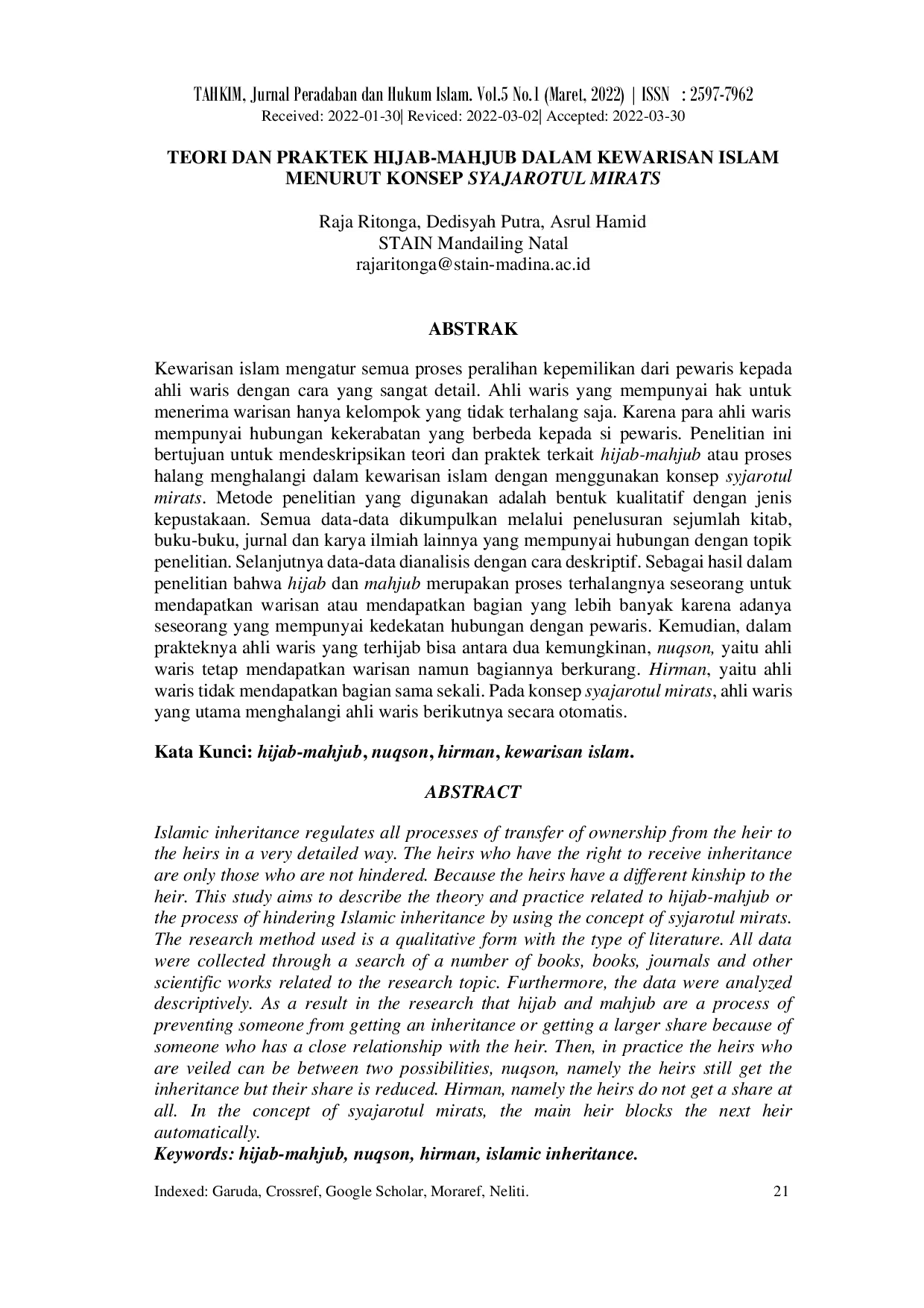 Tahkim (Jurnal Peradaban dan Hukum Islam)Tahkim (Jurnal Peradaban dan Hukum Islam)Kewarisan islam mengatur semua proses peralihan kepemilikan dari pewaris kepada ahli waris dengan cara yang sangat detail. Ahli waris yang mempunyai hak untuk menerima warisan hanya kelompok yang tidak terhalang saja. Karena para ahli waris mempunyai hubungan kekerabatan yang berbeda kepada si pewaris. Penelitian ini bertujuan untuk mendeskripsikan teori dan praktek terkait hijab-mahjub atau proses halang menghalangi dalam kewarisan islam dengan menggunakan konsep syajarotul mirats. Metode penelitian yang digunakan adalah bentuk kualitatif dengan jenis kepustakaan. Semua data-data dikumpulkan melalui penelusuran sejumlah kitab, buku-buku, jurnal dan karya ilmiah lainnya yang mempunyai hubungan dengan topik penelitian. Selanjutnya data-data dianalisis dengan cara deskriptif. Sebagai hasil dalam penelitian bahwa hijab dan mahjub merupakan proses terhalangnya seseorang untuk mendapatkan warisan atau mendapatkan bagian yang lebih banyak karena adanya seseorang yang mempunyai kedekatan hubungan dengan pewaris. Kemudian, dalam prakteknya ahli waris yang terhijab bisa antara dua kemungkinan, nuqson, yaitu ahli waris tetap mendapatkan warisan namun bagiannya berkurang. Hirman, yaitu ahli waris tidak mendapatkan bagian sama sekali. Pada konsep syajarotul mirats, ahli waris yang utama menghalangi ahli waris berikutnya secara otomatis.