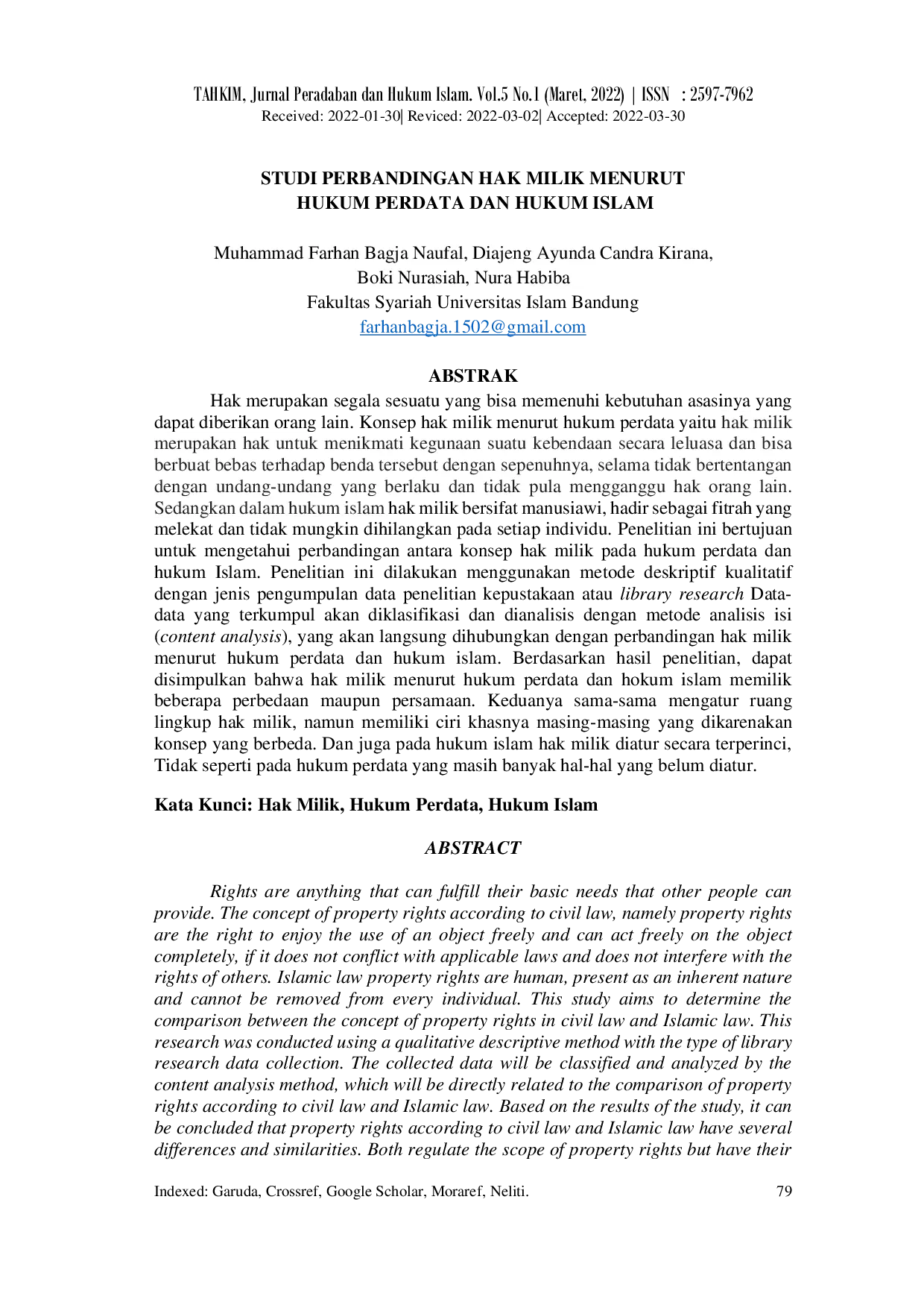 Tahkim (Jurnal Peradaban dan Hukum Islam)Tahkim (Jurnal Peradaban dan Hukum Islam)Hak merupakan segala sesuatu yang bisa memenuhi kebutuhan asasinya yang dapat diberikan orang lain. Konsep hak milik menurut hukum perdata yaitu hak milik merupakan hak untuk menikmati kegunaan suatu kebendaan secara leluasa dan bisa berbuat bebas terhadap benda tersebut dengan sepenuhnya, selama tidak bertentangan dengan undang-undang yang berlaku dan tidak pula mengganggu hak orang lain. Sedangkan dalam hukum islam hak milik bersifat manusiawi, hadir sebagai fitrah yang melekat dan tidak mungkin dihilangkan pada setiap individu. Penelitian ini bertujuan untuk mengetahui perbandingan antara konsep hak milik pada hukum perdata dan hukum Islam. Penelitian ini dilakukan menggunakan metode deskriptif kualitatif dengan jenis pengumpulan data penelitian kepustakaan atau library research. Data-data yang terkumpul akan diklasifikasi dan dianalisis dengan metode analisis isi (content analysis), yang akan langsung dihubungkan dengan perbandingan hak milik menurut hukum perdata dan hukum islam. Berdasarkan hasil penelitian, dapat disimpulkan bahwa hak milik menurut hukum perdata dan hokum islam memiliki beberapa perbedaan maupun persamaan. Keduanya sama-sama mengatur ruang lingkup hak milik, namun memiliki ciri khasnya masing-masing yang dikarenakan konsep yang berbeda. Dan juga pada hukum islam hak milik diatur secara terperinci, Tidak seperti pada hukum perdata yang masih banyak hal-hal yang belum diatur.