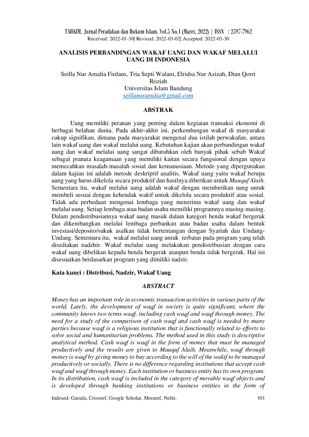 Tahkim (Jurnal Peradaban dan Hukum Islam)Tahkim (Jurnal Peradaban dan Hukum Islam)Uang memiliki peranan penting dalam transaksi ekonomi global. Perkembangan wakaf di masyarakat cukup signifikan, dengan dua istilah yang dikenal: wakaf uang dan wakaf melalui uang. Kajian komparatif antara keduanya sangat dibutuhkan karena wakaf berperan dalam memecahkan masalah sosial dan kemanusiaan. Metode penelitian yang digunakan adalah deskriptif analitis. Wakaf uang adalah wakaf berupa uang yang dikelola secara produktif, dengan hasil untuk Mauquf Alaih. Sementara, wakaf melalui uang adalah wakaf dengan uang untuk membeli aset yang dikelola secara produktif atau sosial. Tidak ada perbedaan lembaga penerima wakaf uang dan wakaf melalui uang. Distribusi wakaf uang termasuk benda bergerak dan dikembangkan melalui lembaga perbankan syariah dalam bentuk investasi yang sesuai syariah dan undang-undang. Wakaf melalui uang terbatas pada program yang disediakan nadzir, dengan pendistribusian melalui pembelian aset bergerak atau tidak bergerak sesuai program nadzir.