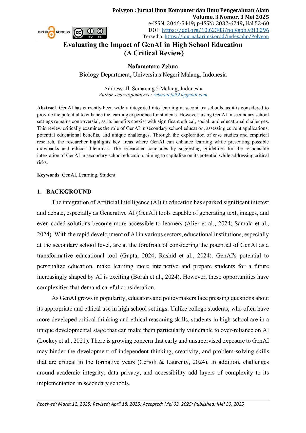 Polygon : Jurnal Ilmu Komputer dan Ilmu Pengetahuan AlamPolygon : Jurnal Ilmu Komputer dan Ilmu Pengetahuan AlamIntegrasi Artificial Intelligence (AI) dalam pendidikan telah menimbulkan minat dan perdebatan yang signifikan, terutama dengan semakin mudahnya akses terhadap alat-alat Generative AI (GenAI) yang mampu menghasilkan teks, gambar, dan bahkan solusi kode bagi para pelajar (Alier et al., 2024; Samala et al., 2024). Dengan perkembangan AI yang cepat di berbagai sektor, institusi pendidikan, khususnya di tingkat sekolah menengah, berada di garis depan dalam mempertimbangkan potensi GenAI sebagai alat pendidikan transformatif (Gupta, 2024; Rashid et al., 2024). Potensi GenAI untuk menyesuaikan pendidikan secara personal, membuat pembelajaran lebih interaktif, dan mempersiapkan siswa untuk masa depan yang semakin dipengaruhi oleh AI sangat menarik (Borah et al., 2024). Namun, peluang-peluang ini memiliki kompleksitas yang menuntut pertimbangan yang cermat.