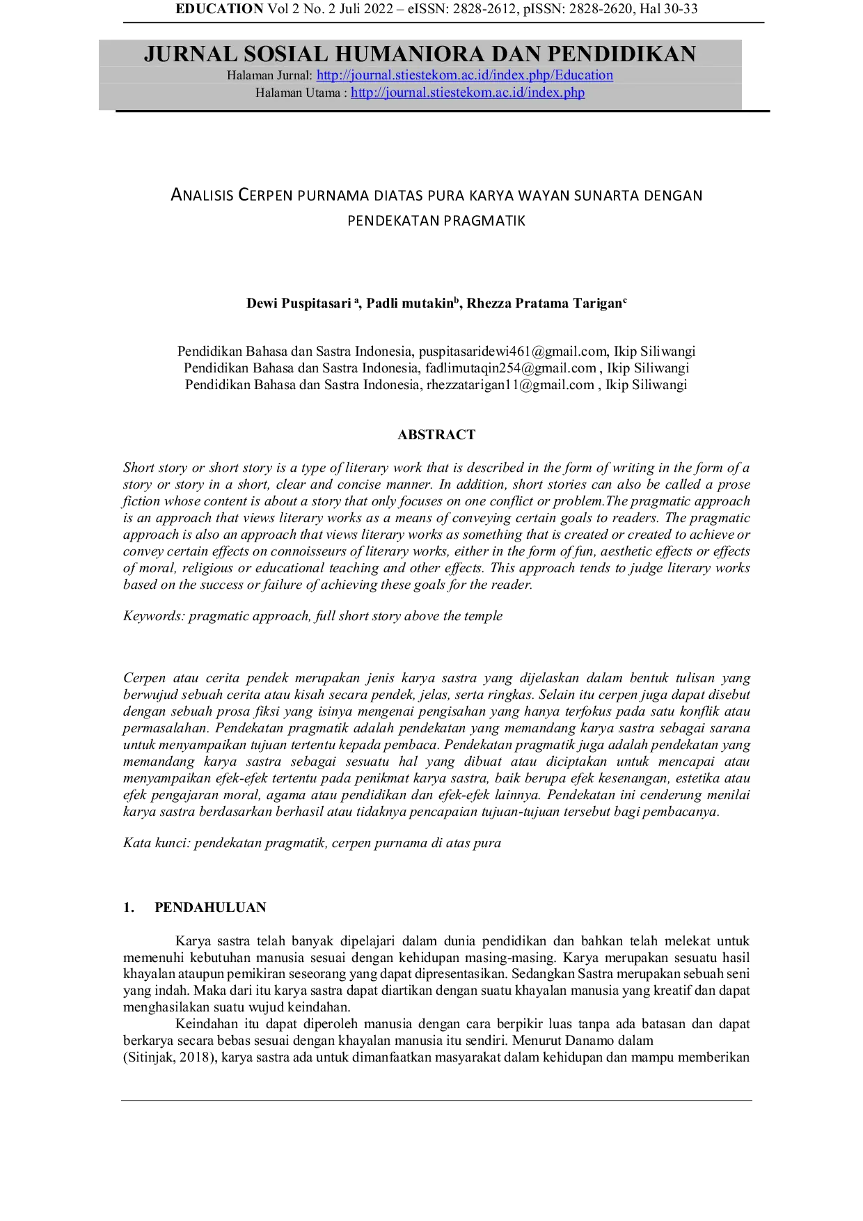 Education : Jurnal Sosial Humaniora dan PendidikanEducation : Jurnal Sosial Humaniora dan PendidikanCerita pendek adalah jenis karya sastra yang dijelaskan dalam bentuk tulisan yang berwujud sebuah cerita atau kisah secara pendek, jelas, serta ringkas. Selain itu cerpen juga dapat disebut dengan sebuah prosa fiksi yang isinya mengenai pengisahan yang hanya terfokus pada satu konflik atau permasalahan. Pendekatan pragmatik adalah pendekatan yang memandang karya sastra sebagai sarana untuk menyampaikan tujuan tertentu kepada pembaca. Pendekatan pragmatik juga adalah pendekatan yang memandang karya sastra sebagai sesuatu hal yang dibuat atau diciptakan untuk mencapai atau menyampaikan efek-efek tertentu pada penikmat karya sastra, baik berupa efek kesenangan, estetika atau efek pengajaran moral, agama atau pendidikan dan efek-efek lainnya. Pendekatan ini cenderung menilai karya sastra berdasarkan berhasil atau tidaknya pencapaian tujuan-tujuan tersebut bagi pembacanya.