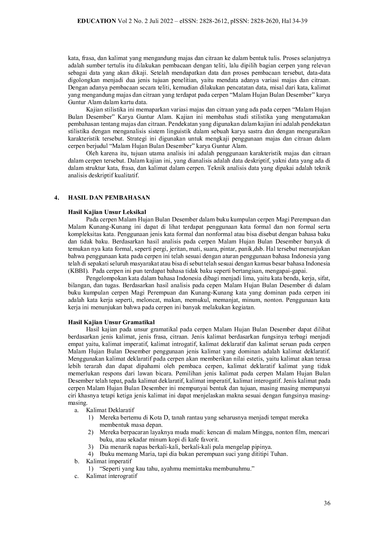 Education : Jurnal Sosial Humaniora dan PendidikanEducation : Jurnal Sosial Humaniora dan PendidikanMakna sebuah karya sastra bergantung pada penggunaan gaya bahasa. Gaya bahasa merupakan ilmu yang dipelajari dalam kajian stilistika pada karya sastra. Dalam karya sastra gaya bahasa merupakan media utama yang digunakan sebagai ungkapan perasaan, pikiran dan batin seorang pengarang. Terutama dalam sebuah Cerpen, gaya bahasa sangat penting dalam karya sastra guna memberikan efek tertentu pada pembacanya. Subjek penelitian kajian stilistika ini berjudul berjudul “Malam Hujan Bulan Desember Karya Guntur Alam dalam kumpulan Cerpen Magi Perempuan dan Malam Kunang-kunang. Tujuan penelitian kajian stilistika ini adalah untuk menguraikan dan untuk mengungkapkan gaya bahasa yang digunakan oleh penulis. Penelitian ini menggunakan metode kualitatif deskriptif dengan tujuan untuk menemukan makna dan fungsi stilistika pada karya sastra cerpen tersebut. Dari segi gramatikal, kompleksitas muncul adalah kata-kata: sederhana, formal, verbal. Dalam aspek leksikal, kalimat sederhana dan kalimat deklaratif yang sering muncul.