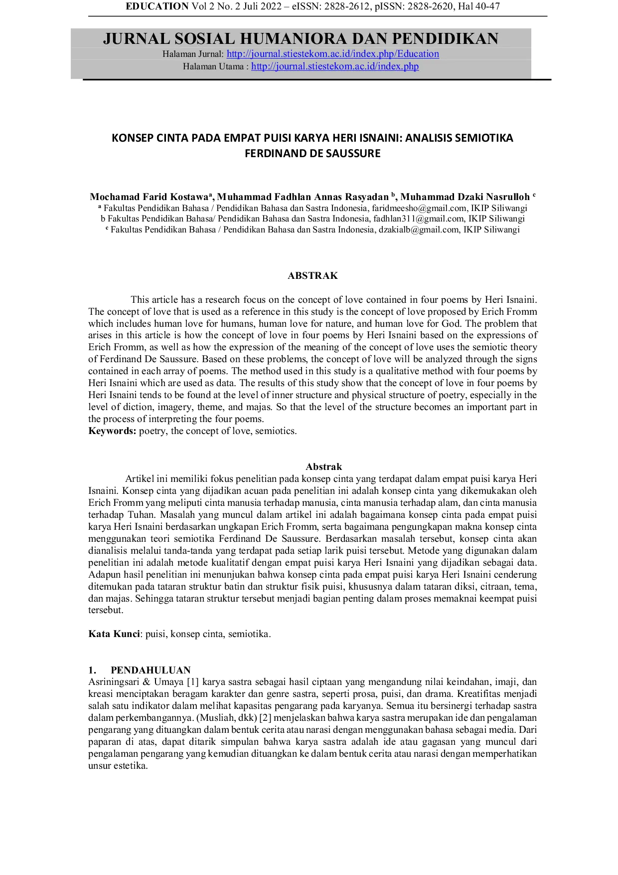 Education : Jurnal Sosial Humaniora dan PendidikanEducation : Jurnal Sosial Humaniora dan PendidikanArtikel ini berfokus pada penelitian konsep cinta yang terkandung dalam empat puisi karya Heri Isnaini. Konsep cinta yang digunakan sebagai acuan dalam penelitian ini adalah konsep cinta yang dikemukakan oleh Erich Fromm, yang meliputi cinta manusia terhadap manusia, cinta manusia terhadap alam, dan cinta manusia terhadap Tuhan. Permasalahan yang muncul dalam artikel ini adalah bagaimana konsep cinta dalam empat puisi karya Heri Isnaini berdasarkan ungkapan Erich Fromm, serta bagaimana pengungkapan makna konsep cinta menggunakan teori semiotika Ferdinand De Saussure. Berdasarkan permasalahan tersebut, konsep cinta akan dianalisis melalui tanda-tanda yang terdapat pada setiap larik puisi. Metode yang digunakan dalam penelitian ini adalah metode kualitatif dengan empat puisi karya Heri Isnaini sebagai data. Hasil penelitian menunjukkan bahwa konsep cinta dalam empat puisi karya Heri Isnaini cenderung ditemukan pada tataran struktur batin dan struktur fisik puisi, khususnya dalam tataran diksi, citraan, tema, dan majas. Sehingga tataran struktur tersebut menjadi bagian penting dalam proses memaknai keempat puisi tersebut.