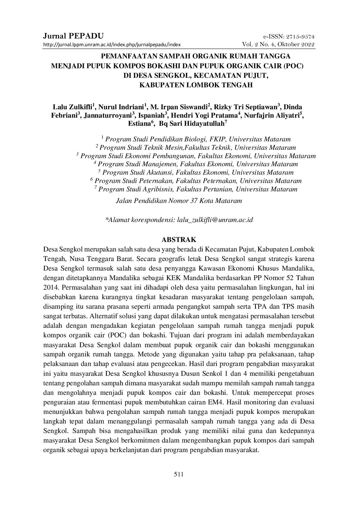 Jurnal PepaduJurnal PepaduDesa Sengkol merupakan salah satu desa yang berada di Kecamatan Pujut, Kabupaten Lombok Tengah, Nusa Tenggara Barat. Secara geografis, letak Desa Sengkol sangat strategis karena termasuk salah satu desa penyangga Kawasan Ekonomi Khusus Mandalika, dengan ditetapkannya Mandalika sebagai KEK Mandalika berdasarkan Peraturan Pemerintah Nomor 52 Tahun 2014. Permasalahan yang saat ini dihadapi oleh desa yaitu permasalahan lingkungan, hal ini disebabkan karena kurangnya tingkat kesadaran masyarakat tentang pengelolaan sampah, disamping itu sarana prasarana seperti armada pengangkut sampah serta Tempat Pembuangan Akhir (TPA) dan Tempat Pembuangan Sementara (TPS) masih sangat terbatas. Alternatif solusi yang dapat dilakukan untuk mengatasi permasalahan tersebut adalah dengan mengadakan kegiatan pengelolaan sampah rumah tangga menjadi pupuk kompos organik cair (POC) dan bokashi. Tujuan dari program ini adalah memberdayakan masyarakat Desa Sengkol dalam membuat pupuk organik cair dan bokashi menggunakan sampah organik rumah tangga. Metode yang digunakan yaitu tahap pra pelaksanaan, tahap pelaksanaan, dan tahap evaluasi atau pengecekan. Hasil dari program pengabdian masyarakat ini yaitu masyarakat Desa Sengkol khususnya Dusun Sengkol 1 dan 4 memiliki pengetahuan tentang pengolahan sampah dimana masyarakat sudah mampu memilah sampah rumah tangga dan mengolahnya menjadi pupuk kompos cair dan bokashi. Untuk mempercepat proses penguraian atau fermentasi pupuk membutuhkan cairan EM4. Hasil monitoring dan evaluasi menunjukkan bahwa pengolahan sampah rumah tangga menjadi pupuk kompos merupakan langkah tepat dalam menanggulangi permasalahan sampah rumah tangga yang ada di Desa Sengkol. Sampah bisa menghasilkan produk yang memiliki nilai guna dan kedepannya masyarakat Desa Sengkol berkomitmen dalam mengembangkan pupuk kompos dari sampah organik sebagai upaya berkelanjutan dari program pengabdian masyarakat.