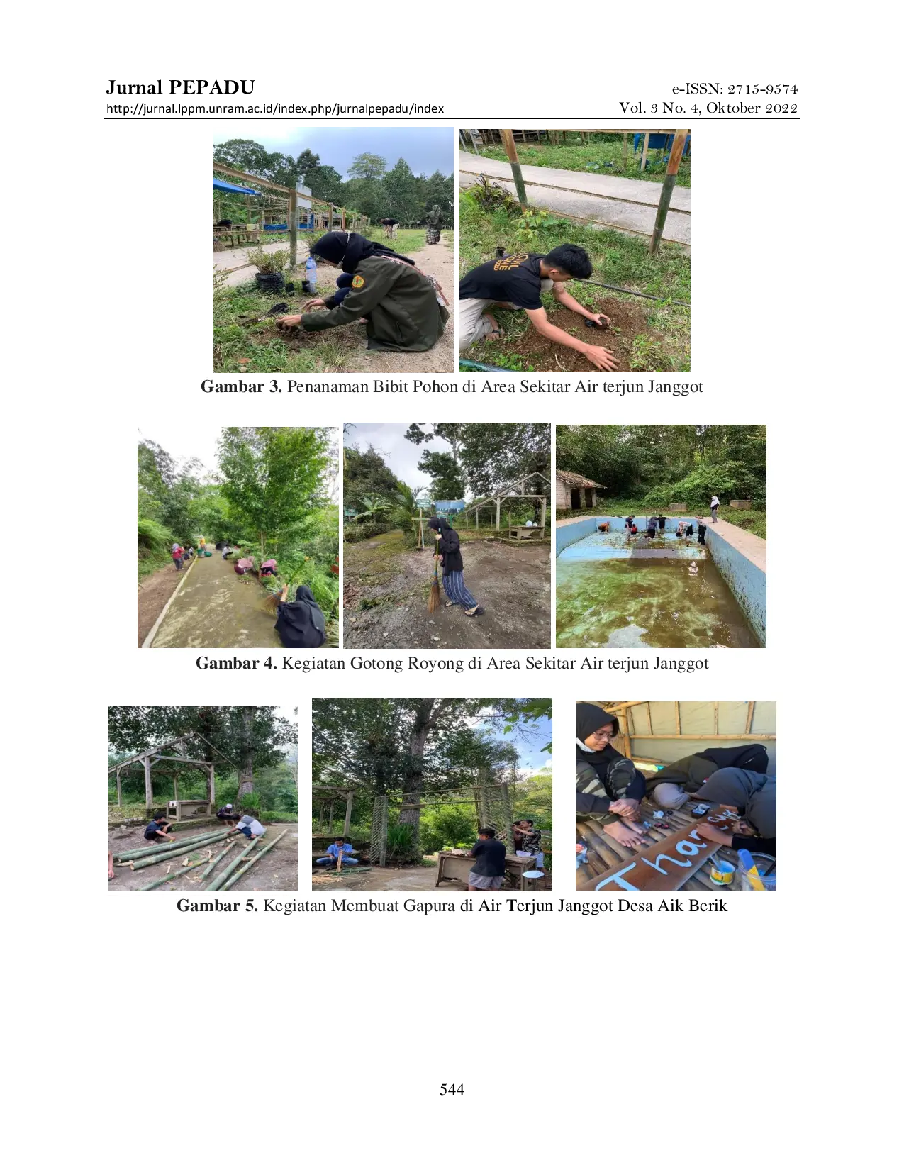 Jurnal PepaduJurnal PepaduAir terjun Gunung Janggot merupakan salah satu objek wisata yang memiliki potensi untuk dikembangkan dan dioptimalkan pengelolaannya. Selain keindahan dan panorama alam yang cukup menakjubkan, objek wisata Gunung Janggot ini juga terbilang unik. Namun, sejumlah sarana pendukung wisata seperti ruang ganti pakaian, berugak, toilet, musholla, dan lainnya kurang memadai karena lokasi tersebut masih baru. Mahasiswa KKN Tematik Unram Periode 20 Juni – 3 Agustus 2022 berinisiatif untuk mengoptimalkan fasilitas dan sarana pendukung yang ada di air terjun janggot seperti pembuatan gapura, spot foto, pagar pembatas, pembuatan toilet dan penanaman bunga dan juga pohon. Selain itu juga optimalisasi promosi juga dilakukan melalui media sosial dan media massa sehingga air terjun diharapkan lebih dikenal banyak orang.