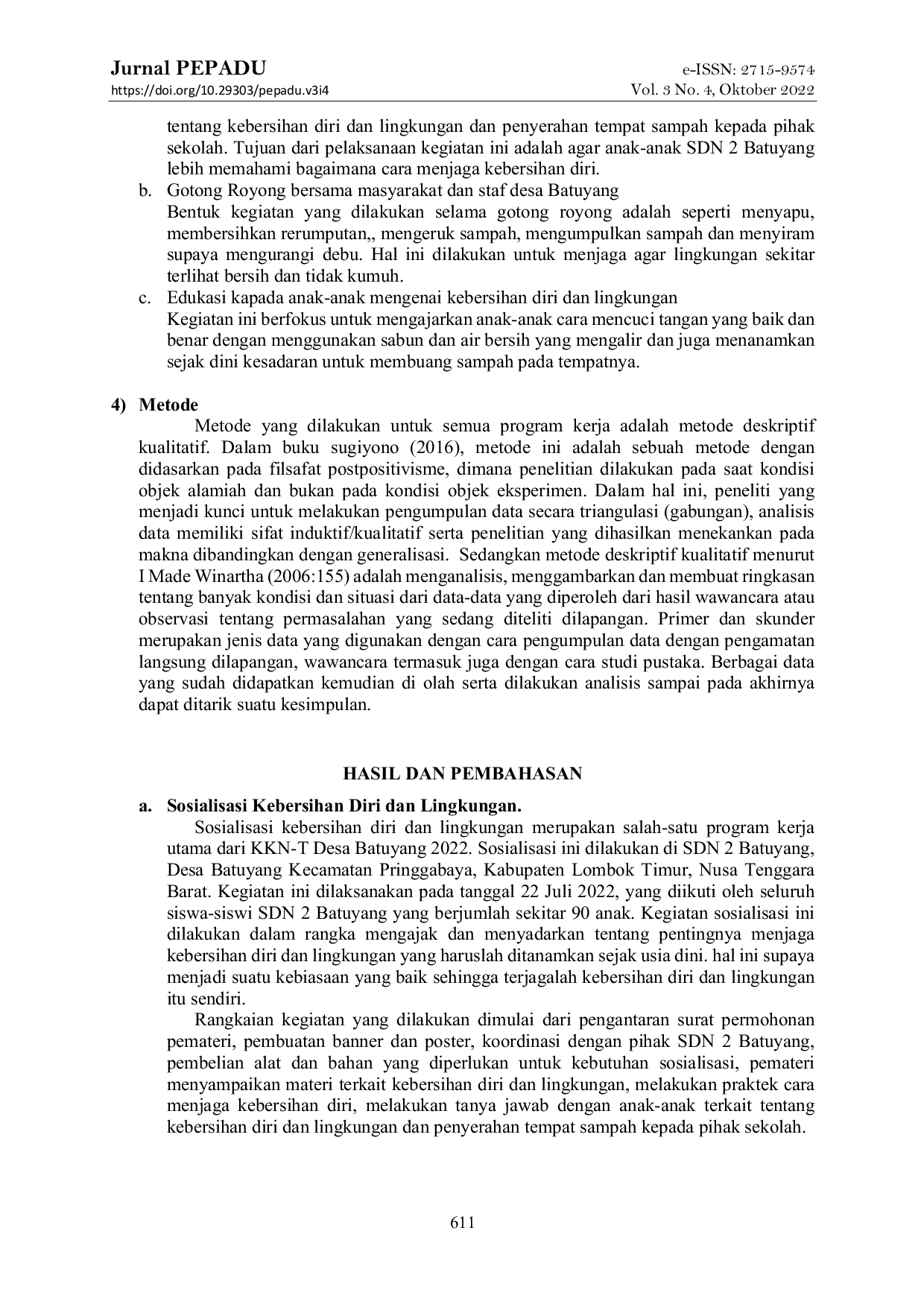 Jurnal PepaduJurnal PepaduKarya tulis ini mengambil tema tentang kebersihan diri dan lingkungan. Penulis menggunakan metode deskriptif kualitatif dengan teknik pengumpulan data yang digunakan adalah observasi lapangan, dokumentasi dan studi pustaka yang diolah dan dianalisis sehingga pada akhirnya dapat ditarik kesimpulan. Kebersihan merupakan cara manusia untuk menjaga diri dan lingkungannya agar tercipta kehidupan yang nyaman dan sehat. Menjaga diri dan lingkungan tetap bersih akan memberikan dampak yang positif untuk ke depannya. Namun, masalah tentang kebersihan diri dan lingkungan tidak ada habisnya. Di Desa Batuyang, kesadaran masyarakat akan hal tersebut masih minim. Oleh karena itu, KKN-T Universitas Mataram berupaya untuk meningkatkan dan membentuk mindset pentingnya kebersihan diri dan lingkungan melalui sosialisasi kebersihan diri dan lingkungan di SDN 2 Batuyang, edukasi tentang kebersihan diri pada anak-anak, dan melaksanakan kegiatan gotong royong membersihkan sampah.
