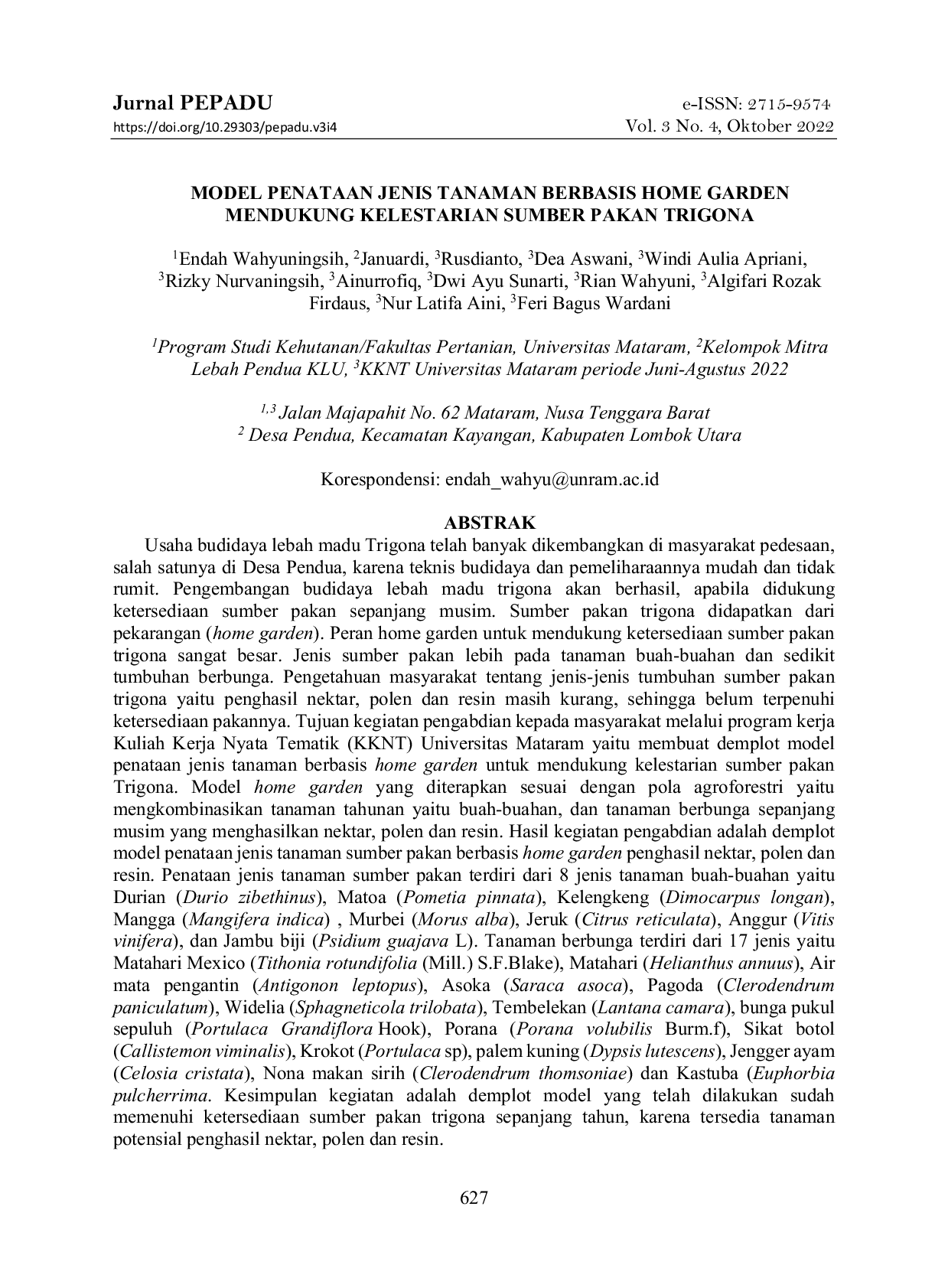 Jurnal PepaduJurnal PepaduUsaha budidaya lebah madu Trigona telah banyak dikembangkan di masyarakat pedesaan, salah satunya di Desa Pendua, karena teknis budidaya dan pemeliharaannya mudah dan tidak rumit. Pengembangan budidaya lebah madu trigona akan berhasil apabila didukung ketersediaan sumber pakan sepanjang musim. Sumber pakan trigona didapatkan dari pekarangan (home garden). Peran home garden untuk mendukung ketersediaan sumber pakan trigona sangat besar. Jenis sumber pakan lebih pada tanaman buah-buahan dan sedikit tumbuhan berbunga. Pengetahuan masyarakat tentang jenis-jenis tumbuhan sumber pakan trigona yaitu penghasil nektar, polen dan resin masih kurang, sehingga belum terpenuhi ketersediaan pakannya. Tujuan kegiatan pengabdian kepada masyarakat melalui program kerja Kuliah Kerja Nyata Tematik (KKNT) Universitas Mataram yaitu membuat demplot model penataan jenis tanaman berbasis home garden untuk mendukung kelestarian sumber pakan Trigona. Model home garden yang diterapkan sesuai dengan pola agroforestri yaitu mengkombinasikan tanaman tahunan yaitu buah-buahan, dan tanaman berbunga sepanjang musim yang menghasilkan nektar, polen dan resin. Hasil kegiatan pengabdian adalah demplot model penataan jenis tanaman sumber pakan berbasis home garden penghasil nektar, polen dan resin. Penataan jenis tanaman sumber pakan terdiri dari 8 jenis tanaman buah-buahan yaitu Durian (Durio zibethinus), Matoa (Pometia pinnata), Kelengkeng (Dimocarpus longan), Mangga (Mangifera indica) , Murbei (Morus alba), Jeruk (Citrus reticulata), Anggur (Vitis vinifera), dan Jambu biji (Psidium guajava L). Tanaman berbunga terdiri dari 17 jenis yaitu Matahari Mexico (Tithonia rotundifolia (Mill.) S.F.Blake), Matahari (Helianthus annuus), Air mata pengantin (Antigonon leptopus), Asoka (Saraca asoca), Pagoda (Clerodendrum paniculatum), Widelia (Sphagneticola trilobata), Tembelekan (Lantana camara), bunga pukul sepuluh (Portulaca Grandiflora Hook), Porana (Porana volubilis Burm.f), Sikat botol (Callistemon viminalis), Krokot (Portulaca sp), palem kuning (Dypsis lutescens), Jengger ayam (Celosia cristata), Nona makan sirih (Clerodendrum thomsoniae) dan Kastuba (Euphorbia pulcherrima. Kesimpulan kegiatan adalah demplot model yang telah dilakukan sudah memenuhi ketersediaan sumber pakan trigona sepanjang tahun, karena tersedia tanaman potensial penghasil nektar, polen dan resin.