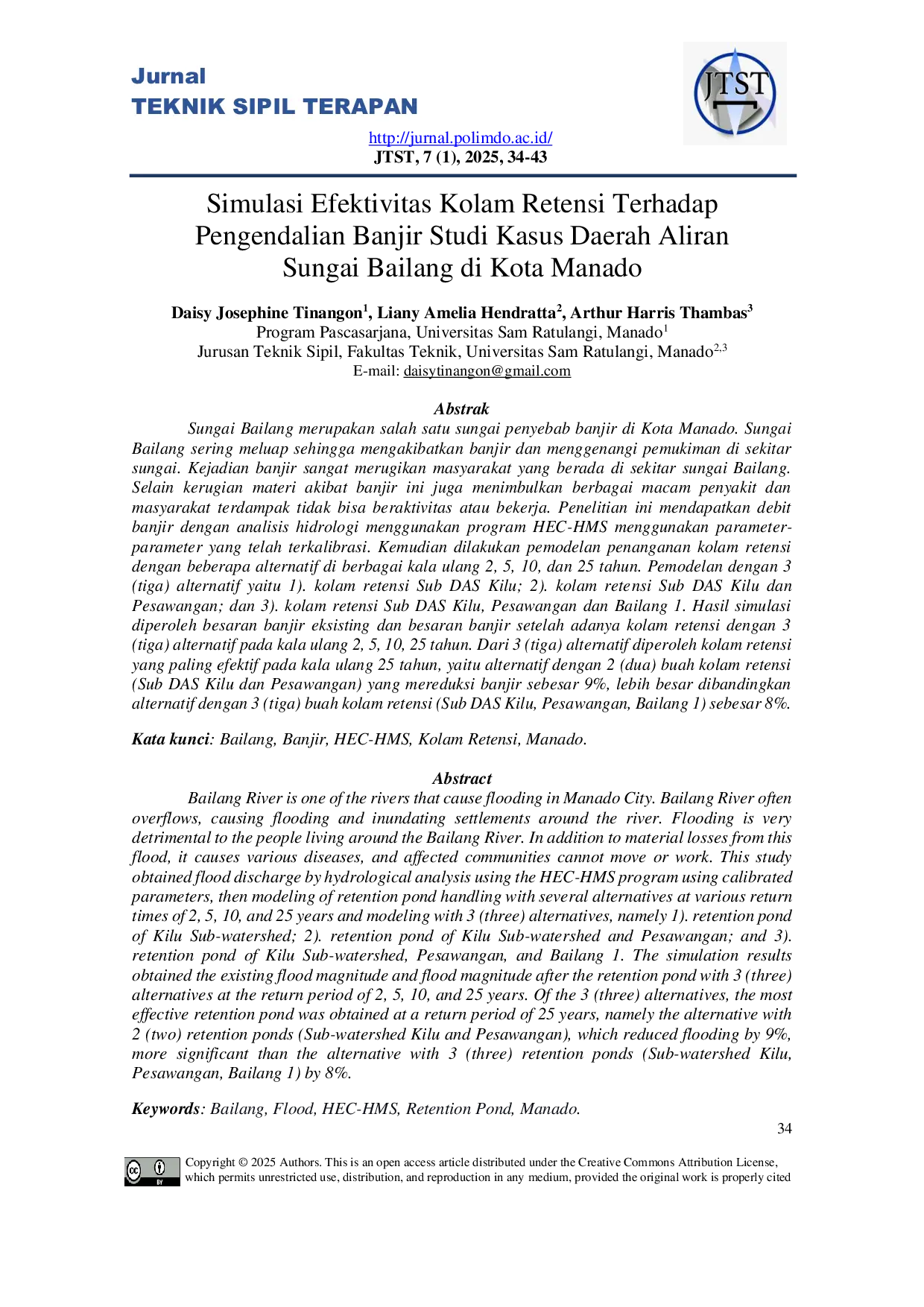 Pertama, perlu diteliti efektivitas penambahan kolam retensi di sub DAS lain seperti Mahawu, Kima Kecil, atau Bailang 2–5 untuk mengetahui kombinasi lokasi yang dapat meningkatkan reduksi banjir secara lebih optimal dibandingkan skenario saat ini. Kedua, perlu dikaji desain kolam retensi dengan sistem pelepasan bertahap agar puncak aliran dari masing-masing kolam tidak terjadi bersamaan, sehingga menghindari penumpukan debit di hilir dan meningkatkan efisiensi pengendalian banjir. Ketiga, perlu dilakukan simulasi dampak perubahan tata guna lahan dan peningkatan curah hujan ekstrem akibat perubahan iklim terhadap kinerja kolam retensi, untuk memastikan infrastruktur ini tetap efektif dalam jangka panjang di bawah kondisi lingkungan yang dinamis. Kombinasi ketiga pendekatan ini akan memberikan rekomendasi perencanaan yang lebih komprehensif, tidak hanya dari sisi teknis infrastruktur tetapi juga adaptasi terhadap dinamika lingkungan dan tata ruang wilayah hulu DAS Bailang.