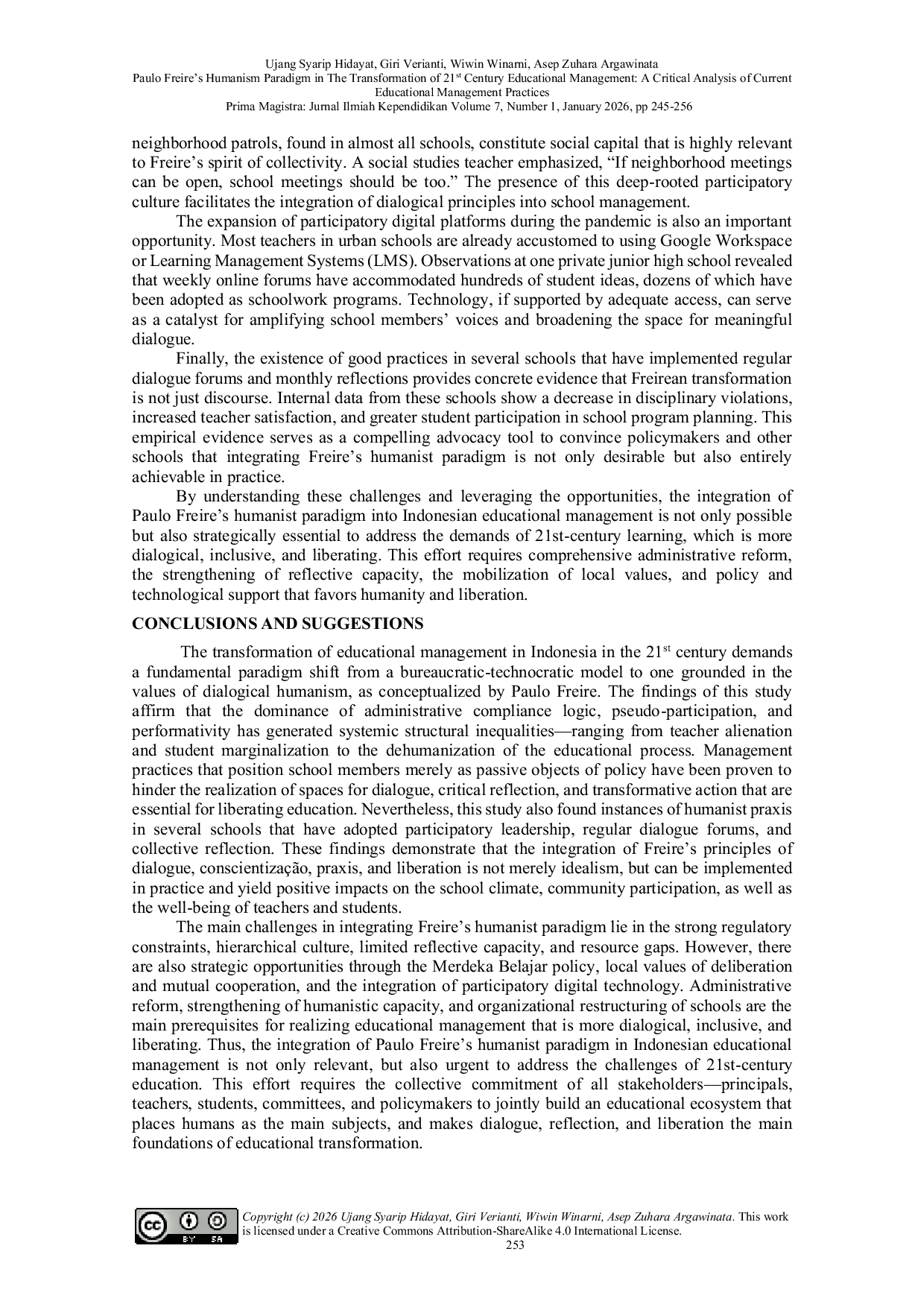Berdasarkan temuan dan analisis dalam penelitian ini, berikut adalah tiga saran penelitian lanjutan yang dapat dipertimbangkan:. . 1. Mengembangkan model manajemen pendidikan yang lebih partisipatif dan reflektif: Penelitian ini menunjukkan bahwa integrasi prinsip-prinsip Freirean, seperti dialog, conscientização, dan praksis, dapat mendorong transformasi manajemen pendidikan. Oleh karena itu, penelitian lanjutan dapat berfokus pada pengembangan model manajemen pendidikan yang mengedepankan partisipasi dan refleksi, dengan melibatkan guru, siswa, dan pihak-pihak terkait dalam proses pengambilan keputusan. Model ini dapat dirancang untuk mendorong dialog yang bermakna, refleksi kritis, dan tindakan transformasional yang sesuai dengan kebutuhan abad ke-21.. . 2. Menerapkan teknologi digital untuk memperluas ruang dialog: Penelitian ini juga menunjukkan potensi teknologi digital dalam memperluas ruang dialog dan partisipasi. Oleh karena itu, penelitian lanjutan dapat mengeksplorasi cara-cara inovatif untuk memanfaatkan teknologi digital, seperti platform partisipasi digital, untuk meningkatkan keterlibatan dan partisipasi anggota sekolah, terutama dalam konteks sekolah-sekolah di daerah pedesaan yang menghadapi kesenjangan digital.. . 3. Mengintegrasikan nilai-nilai lokal dalam manajemen pendidikan: Penelitian ini menekankan pentingnya nilai-nilai lokal, seperti deliberasi dan kerja sama, dalam mengintegrasikan prinsip-prinsip dialogis ke dalam manajemen sekolah. Oleh karena itu, penelitian lanjutan dapat menyelidiki cara-cara untuk mengintegrasikan nilai-nilai lokal ini ke dalam praktik manajemen pendidikan, dengan mempertimbangkan konteks sosial dan budaya yang spesifik di Indonesia. Hal ini dapat membantu menciptakan manajemen pendidikan yang lebih relevan dan responsif terhadap kebutuhan lokal.