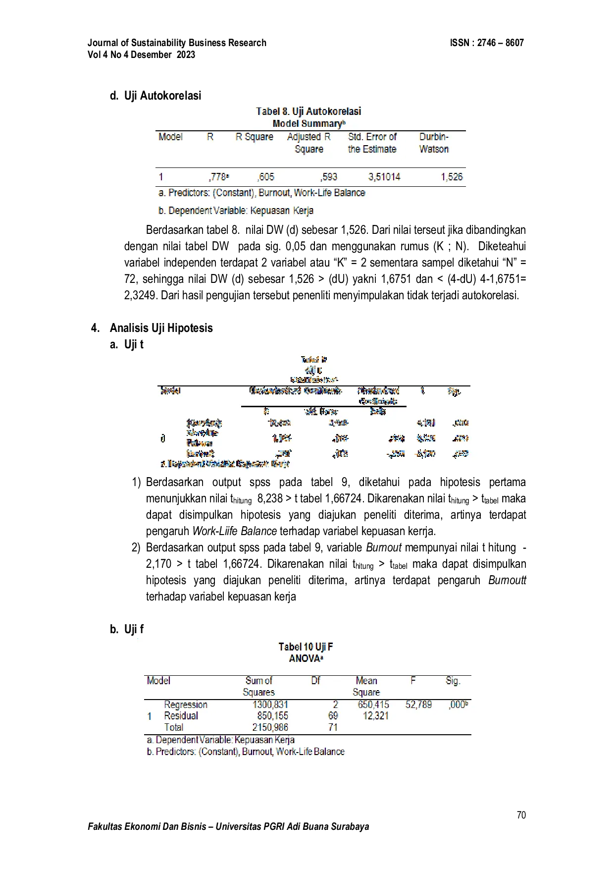 Pertama, terdapat pengaruh positif dan signifikan work-life balance terhadap kepuasan kerja karyawan CV.Kedua, terdapat pengaruh negatif dan signifikan burnout terhadap kepuasan kerja karyawan perusahaan tersebut.Ketiga, work-life balance dan burnout secara bersama-sama memberikan pengaruh positif dan signifikan terhadap kepuasan kerja karyawan.