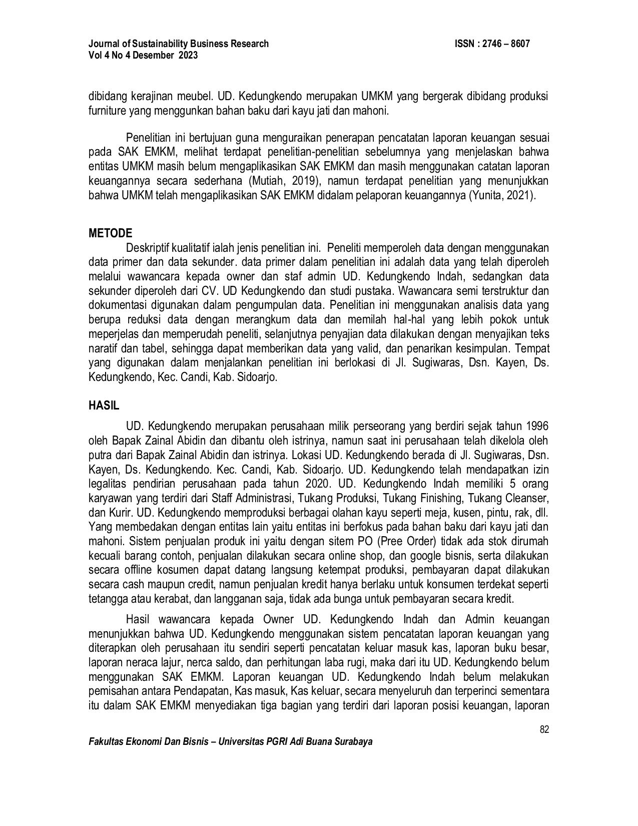 Journal of Sustainability Bussiness Research (JSBR)Journal of Sustainability Bussiness Research (JSBR)UMKM merupakan bidang usaha yang didirikan oleh individu atau satu orang yang tidak merupakan sebuah cabang entitas maupun anak entitas atau perusahaan. UMKM dapat dibedakan menjadi tiga macam, diantaranya adalah usaha mikro, kecil, dan menengah. Secara luas UMKM di Indonesia belum mempraktikkan Standar Akuntansi yang diberlakukan untuk UMKM. Penelitian ini bermaksud dapat menganalisis penerapan pencatatan laporan keuangan berdasarkan Standar Akuntansi Keuangan Entitas Mikro Kecil dan Menengah (SAK EMKM) pada UD Kedungkendo Indah. UD Kedungkendo Indah yaitu UMKM dibidang pengrajinan furniture. Metode penelitian menggunakan deskriptif kualitatif dengan menggunakan data primer yaitu dokumentasi dan wawancara, sedangkan data sekunder diperoleh melalui studi pustaka dan CV UD. Kedungkendo Indah. Hasil penelitian menunjukkan UD. Kedungkendo Indah belum menerapkan laporan keuangan yang sesuai dengan SAK, perihal ini disebabkan pemilik entitas belum memahami terhadapi SAK EMKM serta kekurangan SDM untuk mengelola laporan keuangan secara khusus.