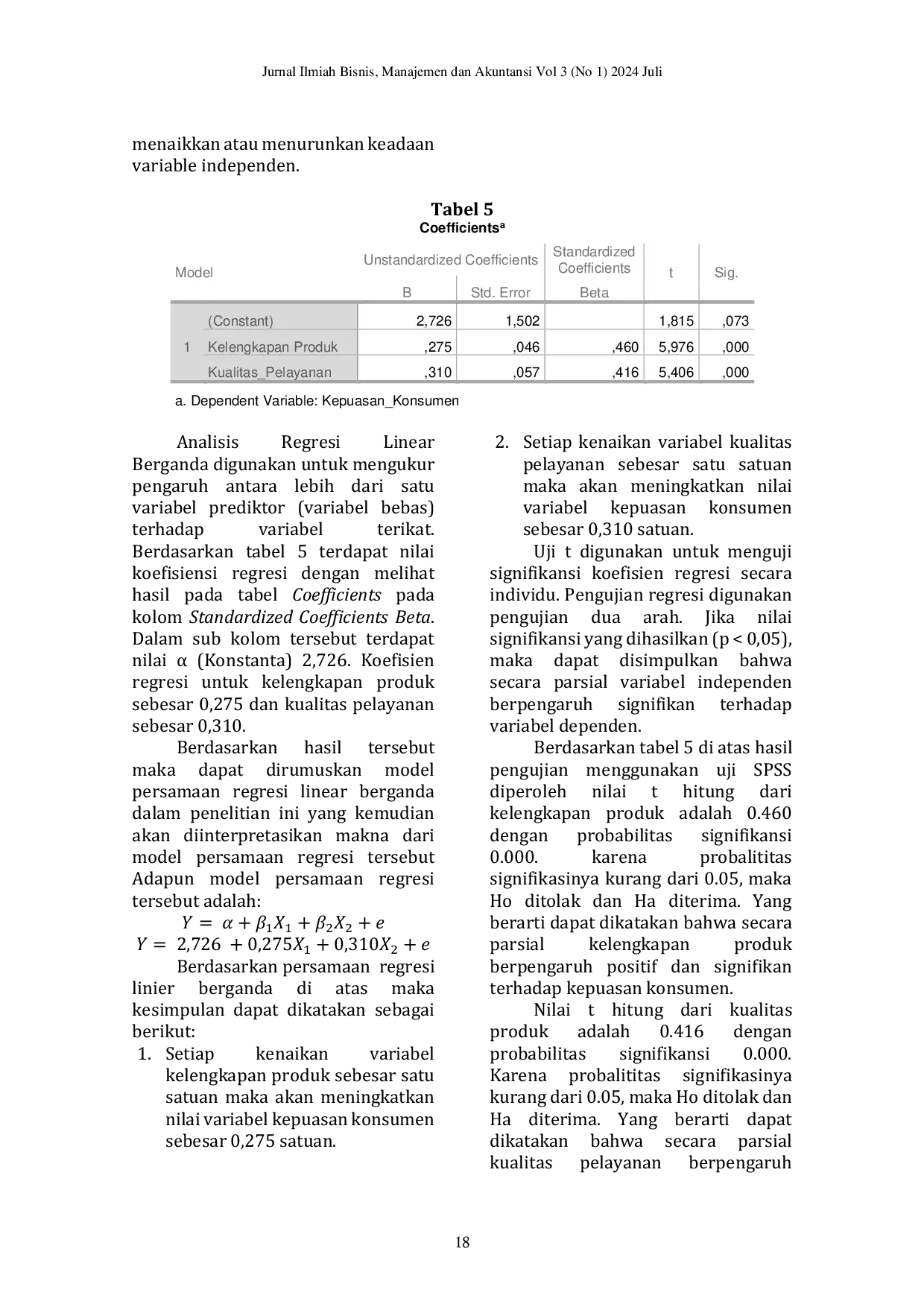 Penelitian ini menunjukkan bahwa masih ada sekitar 42% faktor lain yang memengaruhi kepuasan pelanggan di Arista Mart 2, di luar kelengkapan produk dan kualitas pelayanan. Oleh karena itu, penelitian lanjutan dapat memperluas fokus untuk mengidentifikasi dan mengukur dampak variabel-variabel tersebut. Salah satu arah yang menarik adalah dengan meneliti bagaimana *strategi penetapan harga* dan *berbagai program promosi* yang diterapkan Arista Mart 2 secara langsung maupun tidak langsung memengaruhi kepuasan konsumen, mengingat kedua elemen ini sangat krusial dalam menarik dan mempertahankan pelanggan di tengah persaingan ritel yang ketat. Penelitian dapat mengkaji persepsi konsumen terhadap harga dan efektivitas promosi dalam meningkatkan nilai yang dirasakan.. . Selain itu, untuk memberikan wawasan yang lebih dalam, studi selanjutnya bisa menginvestigasi faktor-faktor internal yang menjadi penopang utama kelengkapan produk dan kualitas pelayanan. Misalnya, bagaimana *kemitraan strategis dengan pemasok* dapat menjamin ketersediaan barang yang beragam dan berkualitas, serta bagaimana *investasi pada pelatihan dan pengembangan karyawan* secara berkelanjutan meningkatkan keterampilan pelayanan, dan pada akhirnya, bagaimana kedua aspek operasional ini secara kumulatif berkontribusi pada kepuasan pelanggan.. . Terakhir, penelitian dapat menjelajahi apakah ada faktor-faktor tertentu yang mengubah kekuatan hubungan antara kelengkapan produk, kualitas pelayanan, dan kepuasan konsumen. Sebagai contoh, menguji peran *tingkat pengalaman belanja sebelumnya* pelanggan atau *tingkat keterlibatan emosional* pelanggan terhadap Arista Mart 2 sebagai variabel moderasi dapat mengungkap kapan dan untuk tipe pelanggan seperti apa, kelengkapan produk dan kualitas pelayanan paling efektif dalam menghasilkan kepuasan. Pendekatan ini akan memberikan pemahaman yang lebih kaya tentang dinamika kepuasan pelanggan.