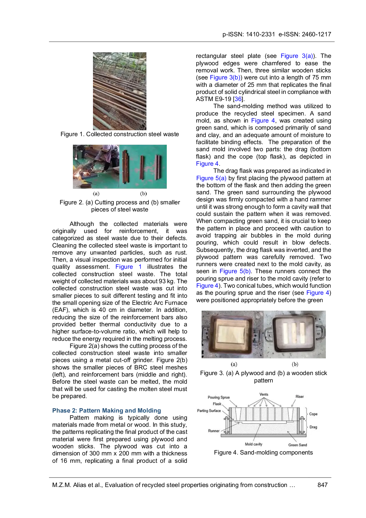 SINERGISINERGIPenelitian ini menyajikan eksperimen sifat baja daur ulang konstruksi yang telah dilebur kembali menjadi spesimen berbentuk komponen menggunakan pengecoran pasir hijau. Serangkaian pengujian tarik, tekan, dan ketangguhan dilakukan. Kemudian, spesimen diamati menggunakan Mikroskop Elektron Pemindai (SEM) dan Energi-Dispersif X-ray (EDX) untuk analisis mikrostruktur dan penentuan komposisi kimia. Eksperimen ini dilakukan untuk menentukan apakah kualitas baja daur ulang memenuhi standar industri. Semua pengujian dilakukan di Universiti Teknologi MARA (UiTM), menyediakan data tentang hubungan tegangan-regangan dan ketangguhan baja daur ulang. Hasil penelitian menunjukkan bahwa baja daur ulang menunjukkan karakteristik tarik di bawah rentang kekuatan standar yang dipersyaratkan oleh Eurocode. Perubahan modulus Young baja dikaitkan dengan paparan suhu tinggi, menyebabkan getaran signifikan dalam atom baja dan meningkatkan jarak antar atom, sehingga mengurangi kekuatan tarik. Pengaruh pengotor juga dapat menjadi faktor yang memengaruhi kekuatan tarik. Pengujian juga menyimpulkan bahwa baja daur ulang konstruksi limbah adalah material getas dengan ketangguhan V-notch rata-rata 24J.