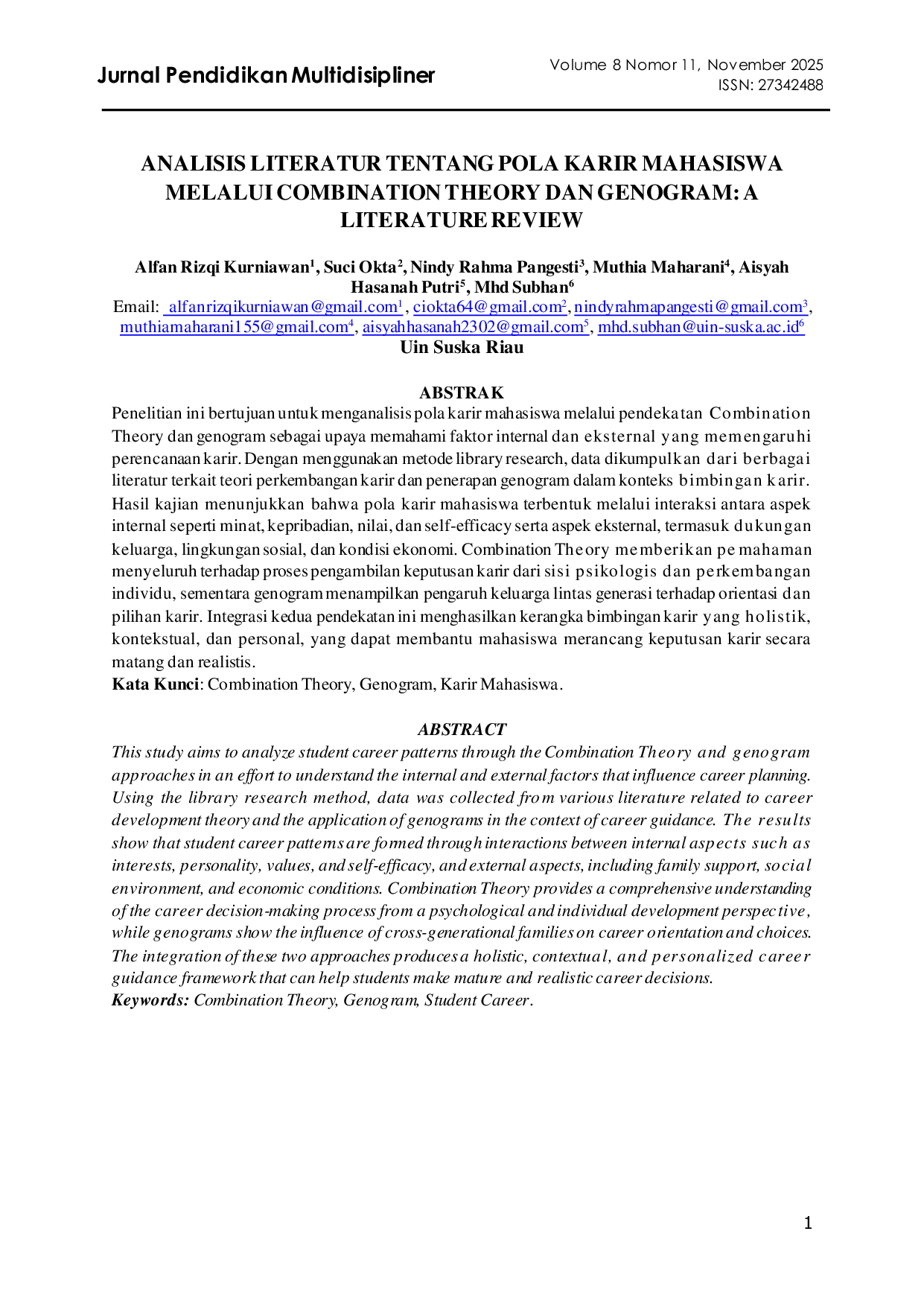 Jurnal Pendidikan MultidisiplinerJurnal Pendidikan MultidisiplinerPenelitian ini bertujuan untuk menganalisis pola karir mahasiswa melalui pendekatan Combination Theory dan genogram sebagai upaya memahami faktor internal dan eksternal yang memengaruhi perencanaan karir. Dengan menggunakan metode library research, data dikumpulkan dari berbagai literatur terkait teori perkembangan karir dan penerapan genogram dalam konteks bimbingan karir. Hasil kajian menunjukkan bahwa pola karir mahasiswa terbentuk melalui interaksi antara aspek internal seperti minat, kepribadian, nilai, dan self-efficacy serta aspek eksternal, termasuk dukungan keluarga, lingkungan sosial, dan kondisi ekonomi. Combination Theory memberikan pemahaman menyeluruh terhadap proses pengambilan keputusan karir dari sisi psikologis dan perkembangan individu, sementara genogram menampilkan pengaruh keluarga lintas generasi terhadap orientasi dan pilihan karir. Integrasi kedua pendekatan ini menghasilkan kerangka bimbingan karir yang holistik, kontekstual, dan personal, yang dapat membantu mahasiswa merancang keputusan karir secara matang dan realistis.