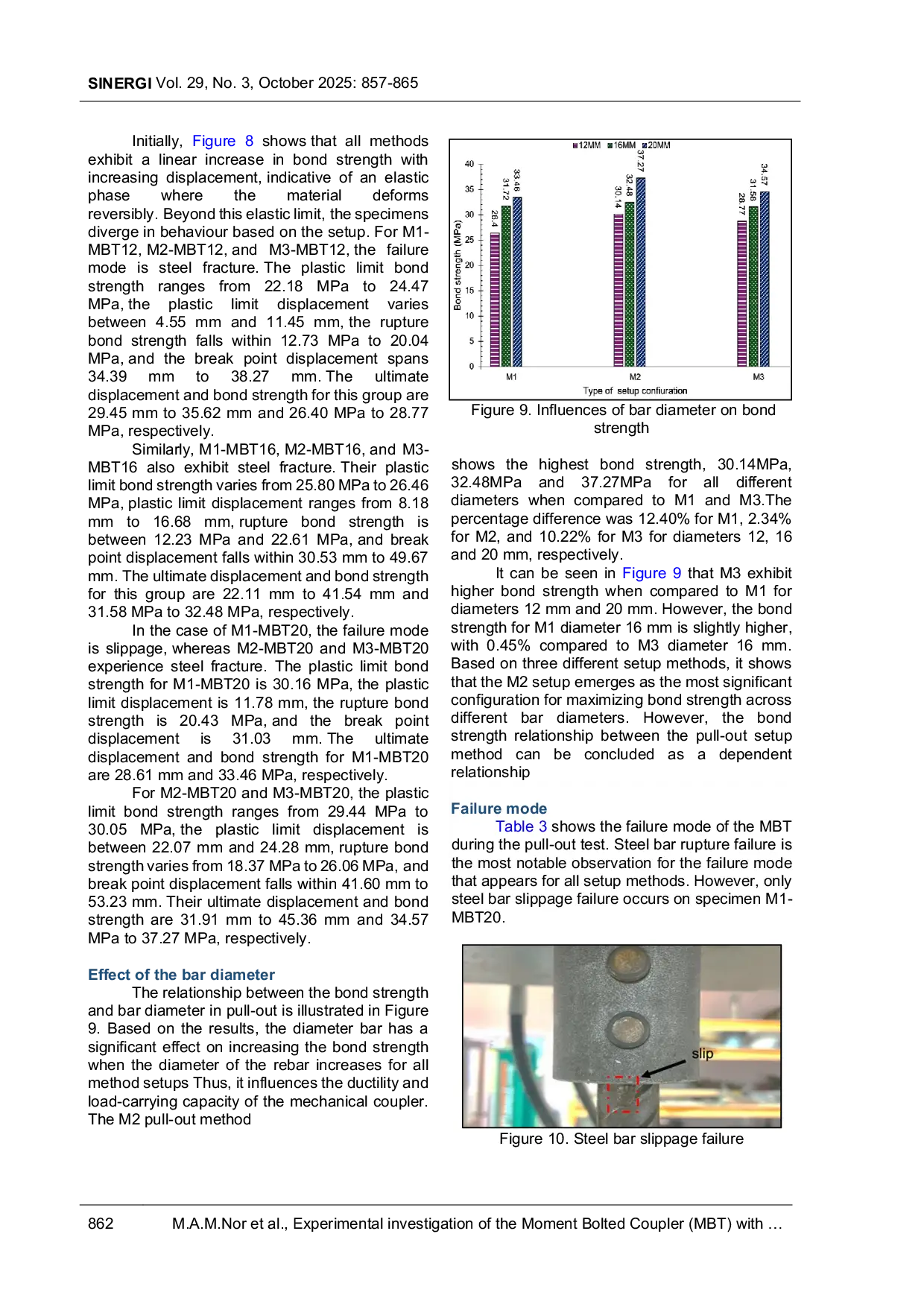 Penelitian ini menyimpulkan bahwa metode M2, yang ditandai dengan pembebanan tarik langsung dan zona penjepitan standar, secara konsisten menghasilkan nilai kekuatan lekat tertinggi pada berbagai diameter batang.Kesederhanaan, keandalan, serta kesesuaiannya dengan prosedur standar menjadikan metode ini pilihan paling tepat untuk menentukan kapasitas maksimum kekuatan lekat MBT.Meskipun metode M1 dan M3 memberikan wawasan tentang perilaku coupler di bawah pembebanan eksentrik dan variasi posisi zona penjepitan, nilai kekuatan lekatnya lebih rendah dibandingkan M2, sehingga metode M2 direkomendasikan sebagai metode utama dalam evaluasi kekuatan lekat MBT secara praktis.