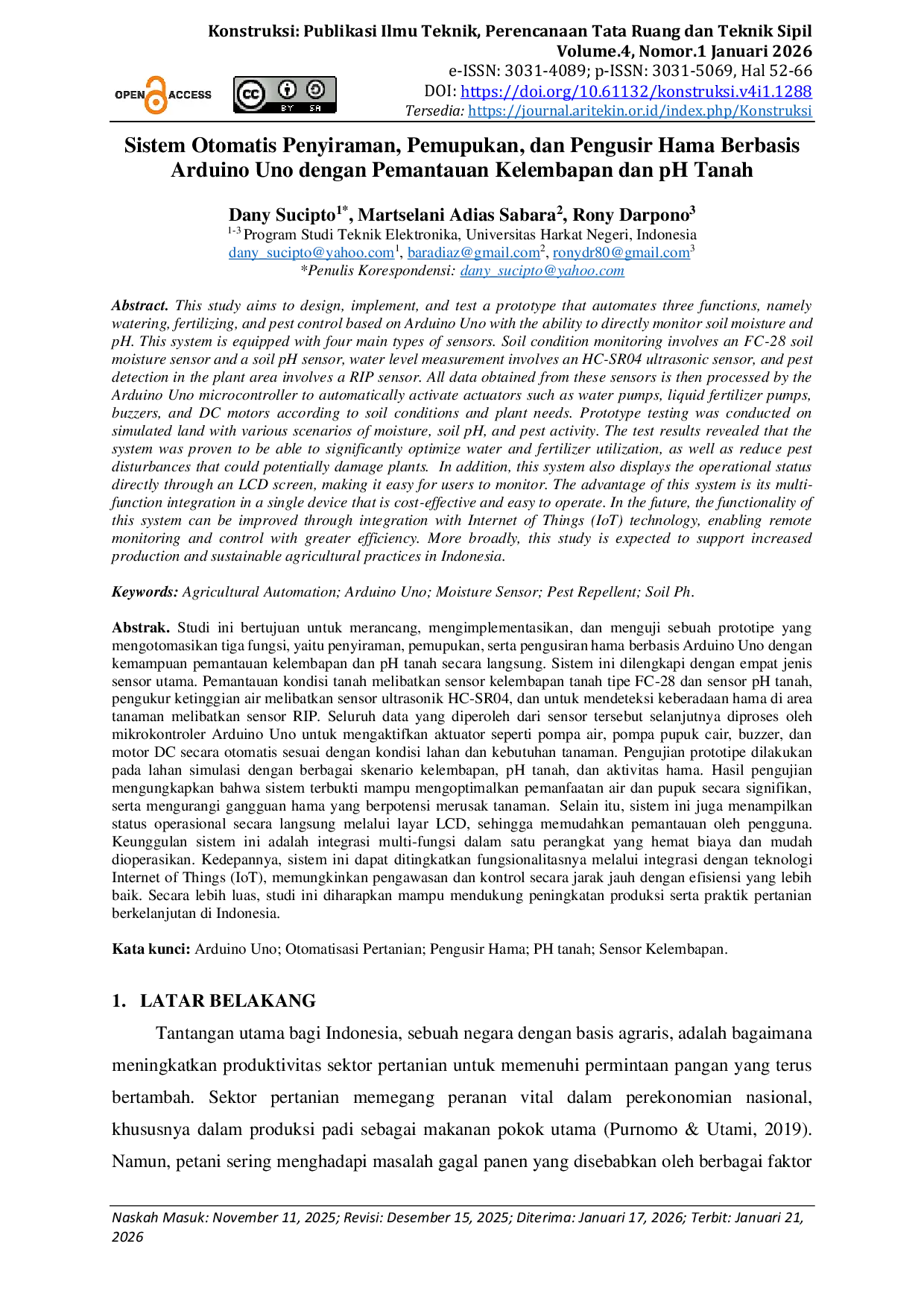 Konstruksi: Publikasi Ilmu Teknik, Perencanaan Tata Ruang dan Teknik SipilKonstruksi: Publikasi Ilmu Teknik, Perencanaan Tata Ruang dan Teknik SipilStudi ini bertujuan untuk merancang, mengimplementasikan, dan menguji sebuah prototipe yang mengotomasikan tiga fungsi, yaitu penyiraman, pemupukan, serta pengusiran hama berbasis Arduino Uno dengan kemampuan pemantauan kelembapan dan pH tanah secara langsung. Sistem ini dilengkapi dengan empat jenis sensor utama. Pemantauan kondisi tanah melibatkan sensor kelembapan tanah tipe FC-28 dan sensor pH tanah, pengukur ketinggian air melibatkan sensor ultrasonik HC-SR04, dan untuk mendeteksi keberadaan hama di area tanaman melibatkan sensor RIP. Seluruh data yang diperoleh dari sensor tersebut selanjutnya diproses oleh mikrokontroler Arduino Uno untuk mengaktifkan aktuator seperti pompa air, pompa pupuk cair, buzzer, dan motor DC secara otomatis sesuai dengan kondisi lahan dan kebutuhan tanaman. Pengujian prototipe dilakukan pada lahan simulasi dengan berbagai skenario kelembapan, pH tanah, dan aktivitas hama. Hasil pengujian mengungkapakan bahwa sistem terbukti mampu mengoptimalkan pemanfaatan air dan pupuk secara signifikan, serta mengurangi gangguan hama yang berpotensi merusak tanaman. Selain itu, sistem ini juga menampilkan status operasional secara langsung melalui layar LCD, sehingga memudahkan pemantauan oleh pengguna. Keunggulan sistem ini adalah integrasi multi-fungsi dalam satu perangkat yang hemat biaya dan mudah dioperasikan. Kedepannya, sistem ini dapat ditingkatkan fungsionalitasnya melalui integrasi dengan teknologi Internet of Things (IoT), memungkinkan pengawasan dan kontrol secara jarak jauh dengan efisiensi yang lebih baik. Secara lebih luas, studi ini diharapkan mampu mendukung peningkatan produksi serta praktik pertanian berkelanjutan di Indonesia.