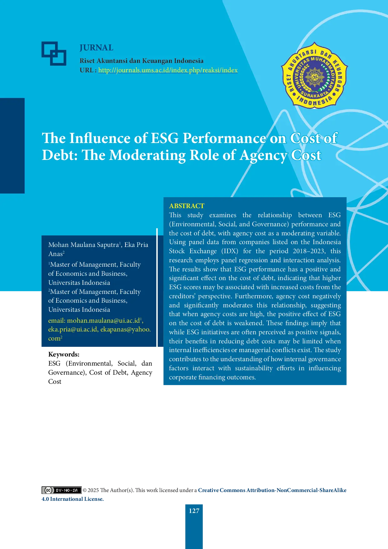 Penelitian ini menemukan bahwa kinerja ESG memiliki hubungan positif dan signifikan terhadap biaya utang di perusahaan yang terdaftar di Indonesia, yang bertentangan dengan ekspektasi umum bahwa ESG mengurangi biaya pendanaan.Hal ini menunjukkan bahwa kreditor di pasar berkembang seperti Indonesia masih melihat keterlibatan ESG sebagai beban biaya tambahan atau inisiatif yang belum terbukti memberikan manfaat finansial yang jelas.Selain itu, biaya agensi memoderasi hubungan tersebut secara signifikan, sehingga pengaruh positif ESG terhadap biaya utang menjadi lebih lemah pada perusahaan dengan biaya agensi yang tinggi, karena sinyal ESG dianggap kurang meyakinkan ketika terdapat konflik agensi yang besar.