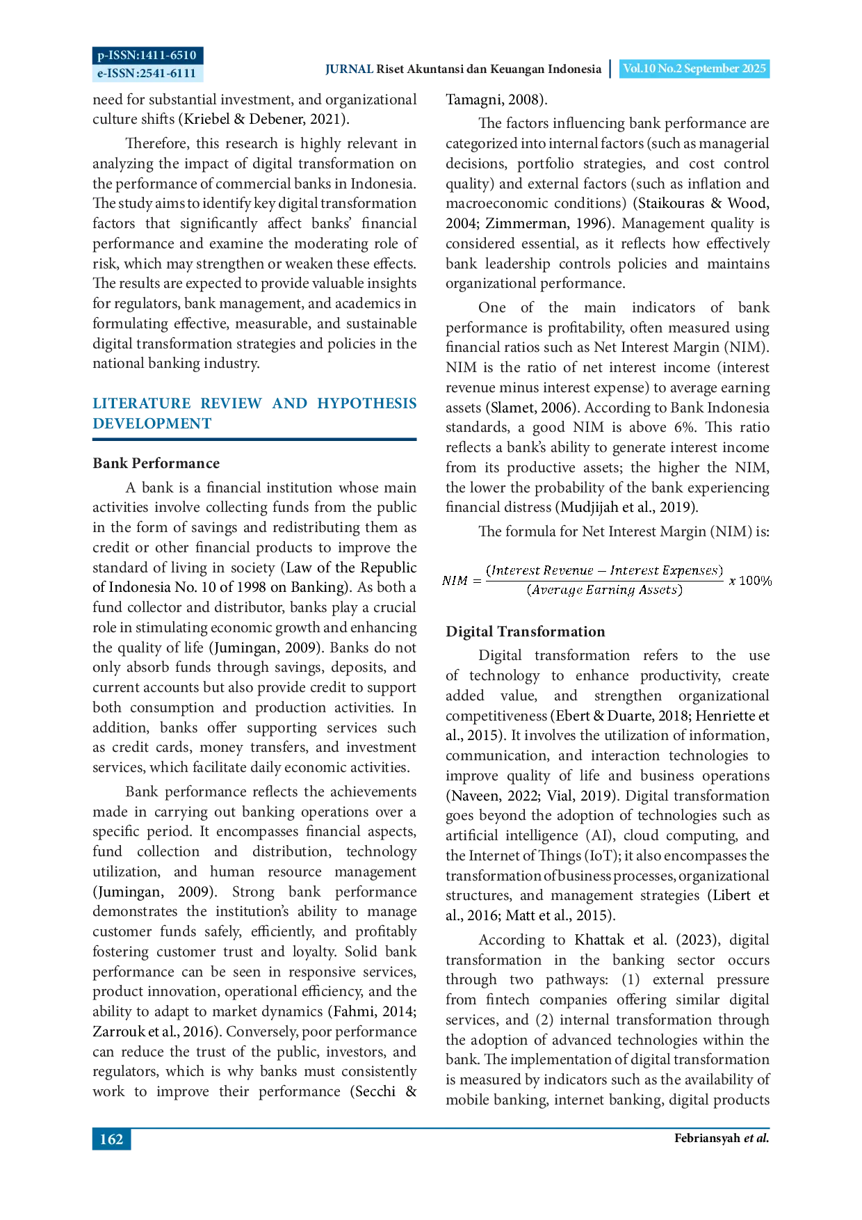 Riset Akuntansi dan Keuangan IndonesiaRiset Akuntansi dan Keuangan IndonesiaThis study analyzes the effect of digital transformation on the performance of Indonesian commercial banks, with financial risk measured by the Z-Score as a moderating variable. Using panel data regression on 21 listed banks from 2019 to 2023, the findings reveal that digital transformation has a positive and significant impact on Net Interest Margin (NIM), reflecting improved efficiency and profitability. However, when financial risk is considered, the direct effect of digital transformation becomes insignificant, suggesting that risk conditions may hinder the optimal benefits of digital initiatives. Interestingly, the interaction term between digital transformation and Z-Score is positive and significant, indicating that banks with higher financial stability are better positioned to leverage digital technologies. Furthermore, leverage and Non-Performing Loans (NPLs) show significant effects, while macroeconomic factors such as inflation and GDP growth are insignificant. These results highlight that the success of digital transformation depends not only on technology adoption but also on financial soundness and effective risk management. The findings provide practical implications for regulators and banking practitioners in designing sustainable digital transformation strategies that enhance competitiveness in the digital era.