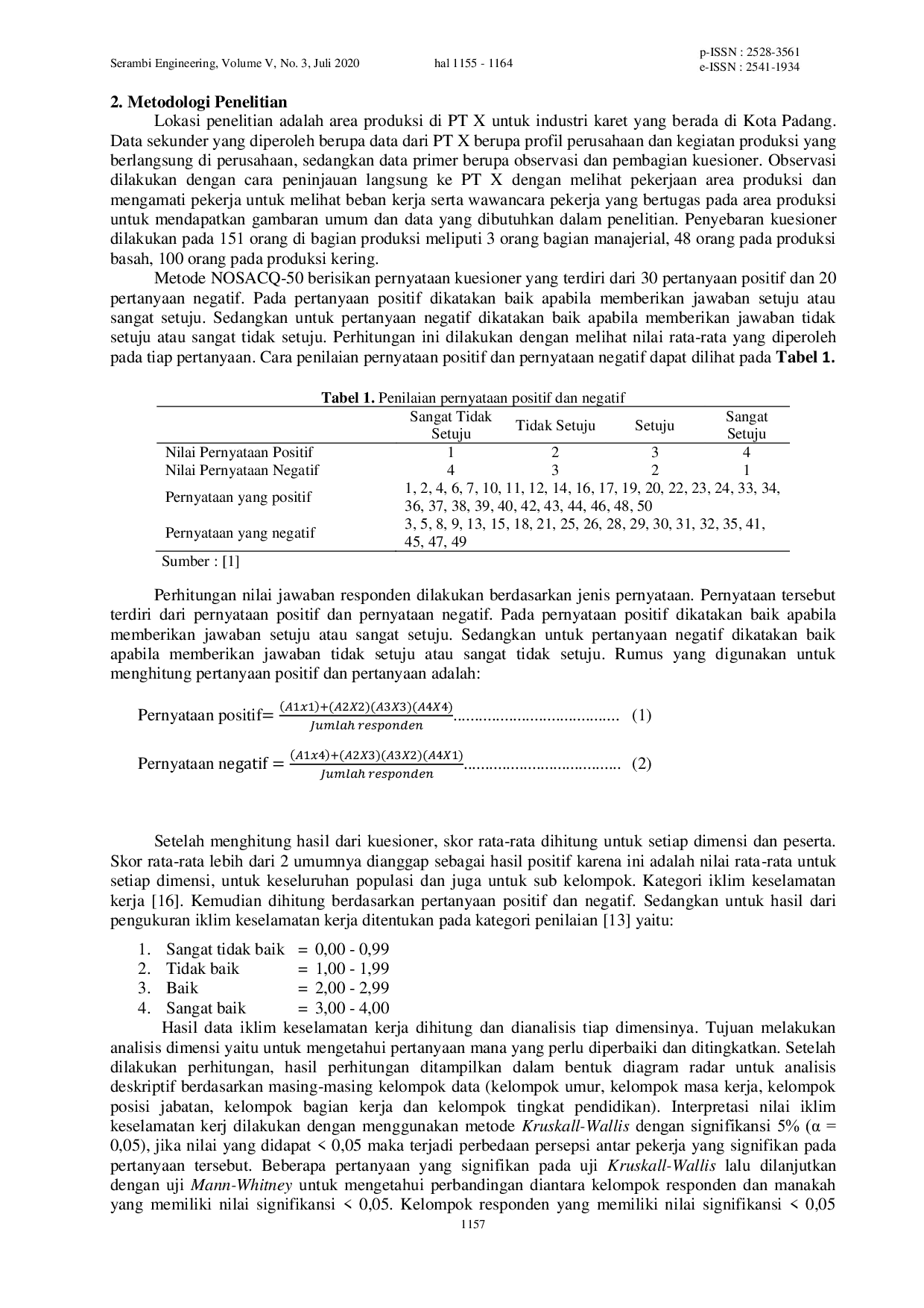 Jurnal Serambi EngineeringJurnal Serambi EngineeringPenelitian ini bertujuan untuk menganalisis iklim keselamatan kerja di bagian produksi di PT. X, industri getah karet di Kota Padang. Responden merupakan pekerja di bagian produksi yang terdiri dari staf manajerial, produksi basah dan produksi kering. Pekerja diwawancara dan mengisi kuesioner dengan metode Nordic Occupational Safety Climate Questionnaire (NOSACQ-50). Metoda NOSACQ-50 terdiri dari 7 dimensi iklim keselamatan kerja. Penelitian menunjukkan, nilai iklim keselamatan kerja pada 7 dimensi yaitu 3,31; 3,30; 3,17; 3,28; 2,98; 3,33 dan 3,21 dan memiliki nilai rata-rata 3,23 yang merupakan kategori sangat baik dalam skala 3 - 4. Terdapat satu dimensi yaitu dimensi kelima yang masih dalam kategori baik yaitu 2,98. Karakteristik responden pada penelitian ini meliputi kelompok umur, masa kerja, pendidikan terakhir, jabatan kerja dan bagian kerja. Setiap kelompok karakteristik responden terbukti memiliki pengaruh terhadap iklim keselamatan kerja dimana terdapat perbedaan persepsi yang signifikan antar kelompok. Solusi perbaikan berdasarkan pengukuran iklim keselamatan yaitu meningkatkan pengetahuan tentang keselamatan kerja, menindak tegas untuk menerapkan penggunaan APD di area produksi, dan melakukan pengecekan berkala pada seluruh alat produksi.