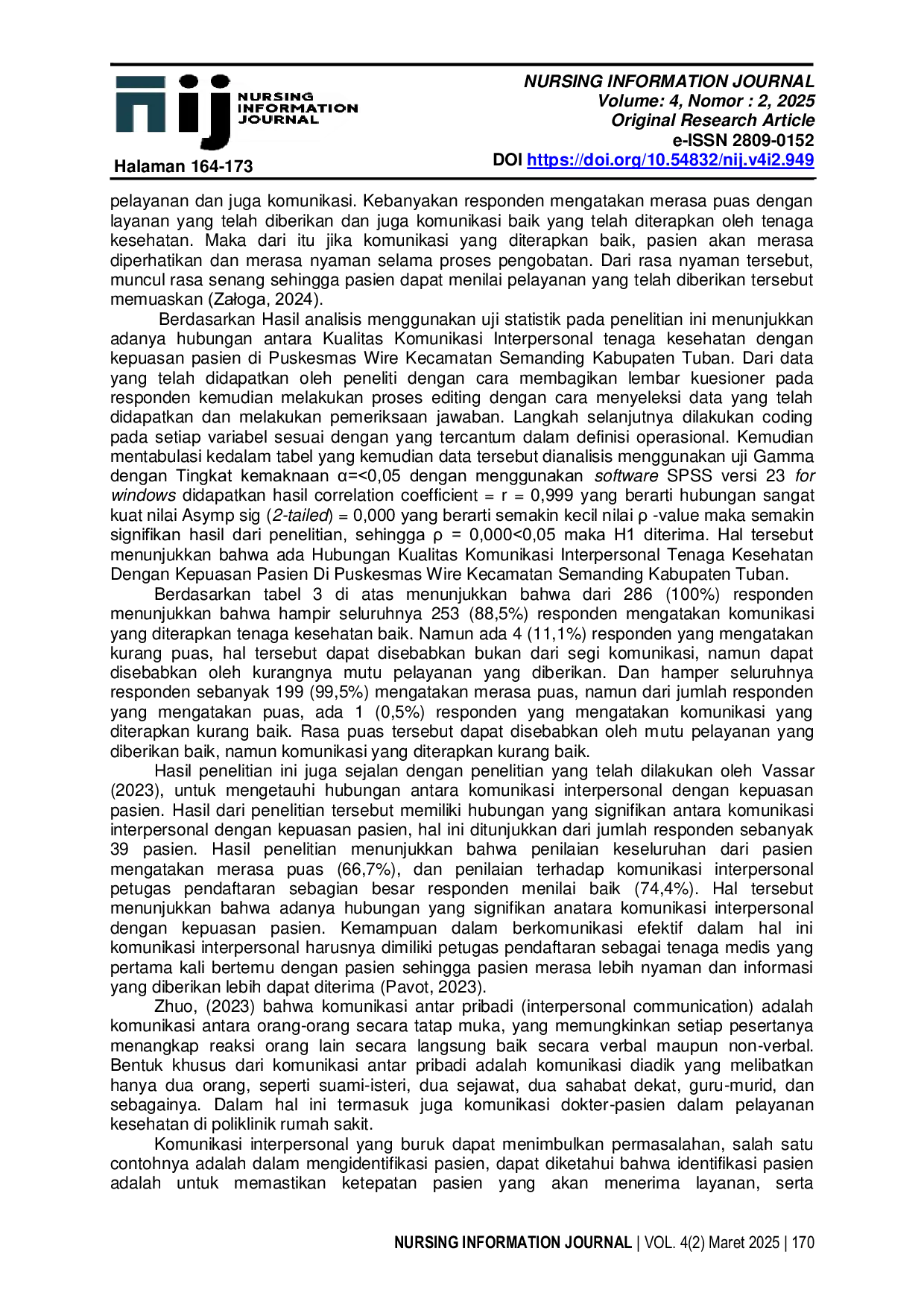 Nursing Information JournalNursing Information JournalPenelitian ini bertujuan untuk mengetahui adanya di Puskesmas Wire Kecamatan Semanding Kabupaten Tuban. Metode penelitian yang digunakan adalah korelasi analitik dengan pendekatan cross-sectional. Hasil penelitian menunjukkan adanya hubungan sangat kuat antara komunikasi interpersonal dengan kepuasan pasien (ρ ˂ α = 0,000˂0,05; r = 0,999). Kesimpulan dari penelitian ini adalah kualitas komunikasi interpersonal tenaga kesehatan memiliki hubungan dengan kepuasan pasien di Puskesmas Wire Kecamatan Semanding Kabupaten Tuban.