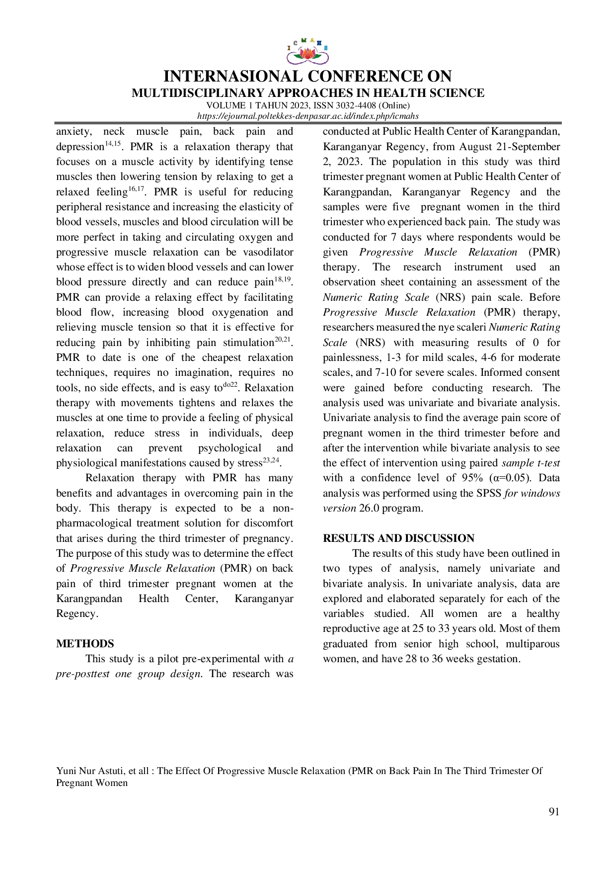International Conference on Multidisciplinary Approaches in Health ScienceInternational Conference on Multidisciplinary Approaches in Health ScienceLatar Belakang: Nyeri punggung merupakan keluhan yang sering dirasakan oleh ibu hamil pada trimester ketiga kehamilan. Pada periode ini, uterus membesar dan menyebabkan otot-otot punggung bawah ibu hamil meregang, menyebabkan nyeri. Salah satu terapi non-farmakologis untuk mengatasi keluhan nyeri punggung adalah teknik relaksasi dengan Relaksasi Otot Progresif (PMR). Penelitian ini bertujuan untuk mengetahui pengaruh Relaksasi Otot Progresif (PMR) terhadap nyeri punggung pada ibu hamil trimester ketiga di Puskesmas Karangpandan, Kabupaten Karanganyar. Metode: Penelitian ini merupakan studi pilot pre-eksperimen dengan desain pretest-posttest satu kelompok saja. Penelitian ini menggunakan 5 ibu hamil trimester ketiga yang mengalami nyeri punggung sebagai sampel. Instrumen penelitian yang digunakan adalah lembar observasi yang berisi penilaian skala nyeri Numeric Rating Scale (NRS). Analisis yang digunakan dalam penelitian ini adalah uji t sampel berpasangan dengan tingkat kepercayaan 95% (α=0,05). Hasil: Terdapat penurunan rata-rata skala nyeri pada ibu hamil trimester ketiga sebelum dan sesudah diberikan terapi Relaksasi Otot Progresif (PMR), yaitu dari 4,4 menjadi 0,2. Hasil uji t sampel berpasangan diperoleh nilai p (0,001) < 0,05, yang berarti terdapat perbedaan rata-rata antara skala nyeri ibu hamil trimester ketiga sebelum dan sesudah diberikan terapi Relaksasi Otot Progresif (PMR). Kesimpulan: Terdapat pengaruh penggunaan terapi Relaksasi Otot Progresif (PMR) terhadap nyeri punggung pada ibu hamil trimester ketiga.