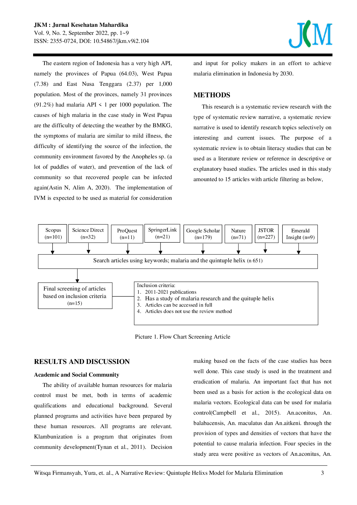 Berdasarkan hasil tinjauan naratif ini, beberapa saran penelitian lanjutan dapat diajukan untuk memperkuat upaya eliminasi malaria di Indonesia. Pertama, penelitian perlu dilakukan untuk mengeksplorasi secara mendalam bagaimana model quintuple helix dapat diadaptasi dan diimplementasikan secara efektif di berbagai konteks geografis dan sosial-budaya di Indonesia, dengan mempertimbangkan karakteristik unik dari setiap daerah. Kedua, studi lebih lanjut diperlukan untuk mengidentifikasi dan mengevaluasi peran spesifik masing-masing sektor (akademisi, industri, pemerintah, media, dan masyarakat) dalam implementasi model quintuple helix, serta bagaimana sinergi antar sektor dapat ditingkatkan. Ketiga, penelitian perlu difokuskan pada pengembangan dan pengujian intervensi berbasis lingkungan yang inovatif dan berkelanjutan, yang terintegrasi dengan pendekatan quintuple helix, untuk mengendalikan vektor malaria dan mengurangi risiko penularan, dengan mempertimbangkan dampak perubahan iklim dan faktor lingkungan lainnya. Penelitian-penelitian ini diharapkan dapat memberikan kontribusi signifikan terhadap pengembangan strategi eliminasi malaria yang lebih komprehensif, adaptif, dan berkelanjutan di Indonesia.
