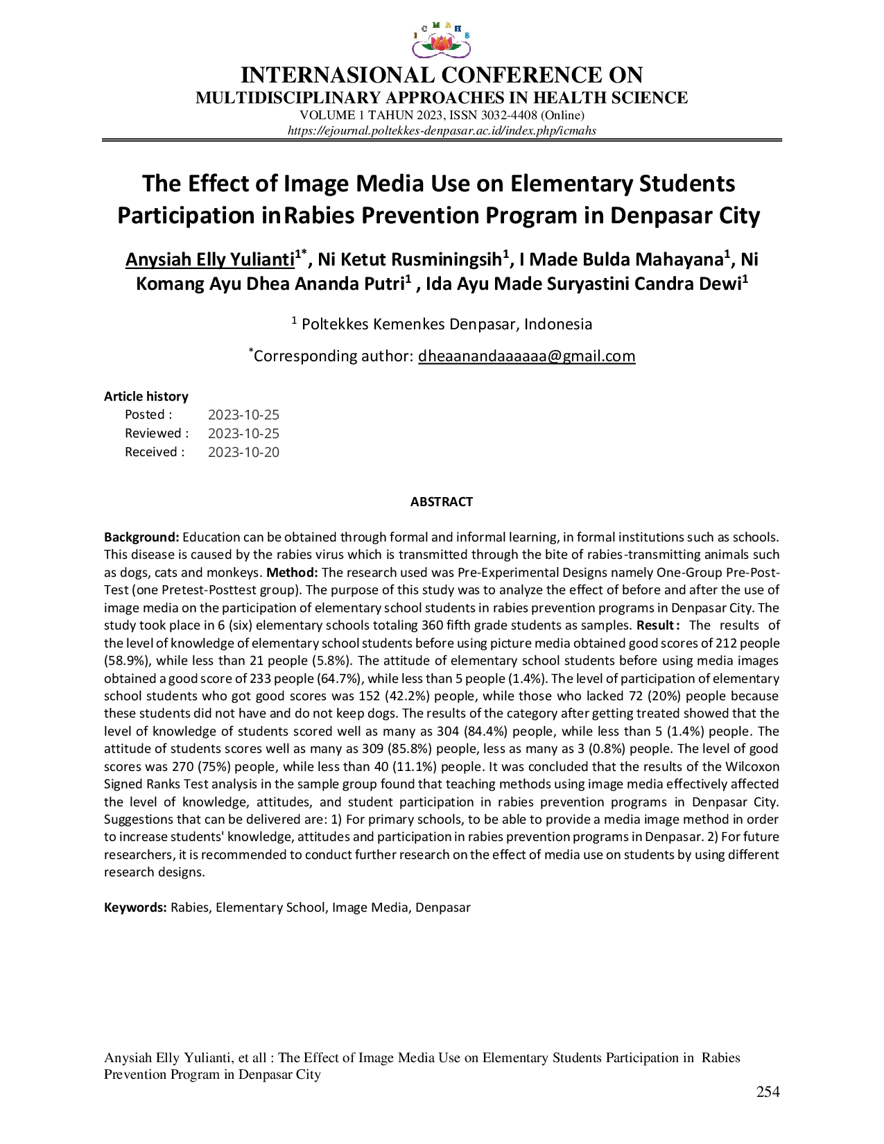 International Conference on Multidisciplinary Approaches in Health ScienceInternational Conference on Multidisciplinary Approaches in Health SciencePendidikan dapat diperoleh melalui pembelajaran formal dan informal, di institusi formal seperti sekolah. Penyakit ini disebabkan oleh virus rabies yang ditularkan melalui gigitan hewan penular rabies seperti anjing, kucing, dan monyet. Penelitian ini menggunakan desain Pra-Eksperimen yaitu One-Group Pre-Post-Test. Tujuan dari penelitian ini adalah untuk menganalisis pengaruh penggunaan media gambar sebelum dan sesudah terhadap partisipasi siswa sekolah dasar dalam program pencegahan rabies di Kota Denpasar. Penelitian ini berlangsung di 6 (enam) sekolah dasar dengan total 360 siswa kelas lima sebagai sampel. Hasil penelitian menunjukkan bahwa tingkat pengetahuan siswa sekolah dasar sebelum menggunakan media gambar memperoleh skor baik sebanyak 212 orang (58,9%), sedangkan kurang sebanyak 21 orang (5,8%). Sikap siswa sekolah dasar sebelum menggunakan media gambar memperoleh skor baik sebanyak 233 orang (64,7%), sedangkan kurang sebanyak 5 orang (1,4%). Tingkat partisipasi siswa sekolah dasar yang memperoleh skor baik adalah 152 (42,2%) orang, sedangkan yang kurang 72 (20%) orang karena siswa tersebut tidak memiliki dan tidak memelihara anjing. Hasil kategori setelah mendapatkan perlakuan menunjukkan bahwa tingkat pengetahuan siswa memperoleh skor baik sebanyak 304 (84,4%) orang, sedangkan kurang sebanyak 5 (1,4%) orang. Sikap siswa memperoleh skor baik sebanyak 309 (85,8%) orang, kurang sebanyak 3 (0,8%) orang. Tingkat skor baik adalah 270 (75%) orang, sedangkan kurang sebanyak 40 (11,1%) orang. Disimpulkan bahwa hasil analisis Uji Peringkat Bertanda Wilcoxon dalam kelompok sampel ditemukan bahwa metode pengajaran menggunakan media gambar secara efektif mempengaruhi tingkat pengetahuan, sikap, dan partisipasi siswa dalam program pencegahan rabies di Kota Denpasar.