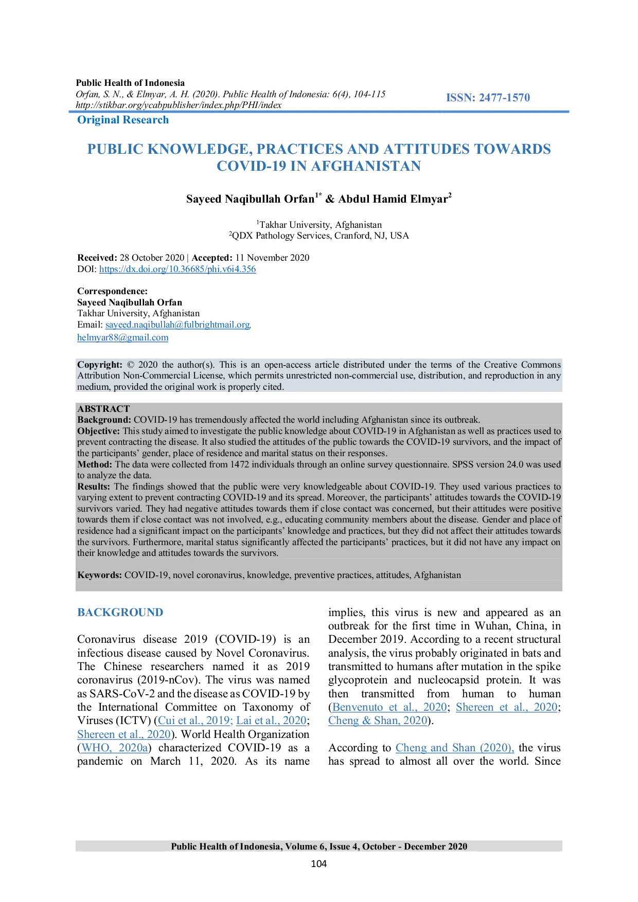 - PUBLIC KNOWLEDGE, PRACTICES AND ATTITUDES TOWARDS COVID-19 IN AFGHANISTAN | Public Health of Indonesia.... stikbar.org/ycabpublisher/index.php/PHI/article/view/356PUBLIC KNOWLEDGE PRACTICES AND ATTITUDES TOWARDS COVID 19 IN AFGHANISTAN Public Health of Indonesia stikbar ycabpublisher index php PHI article view 356