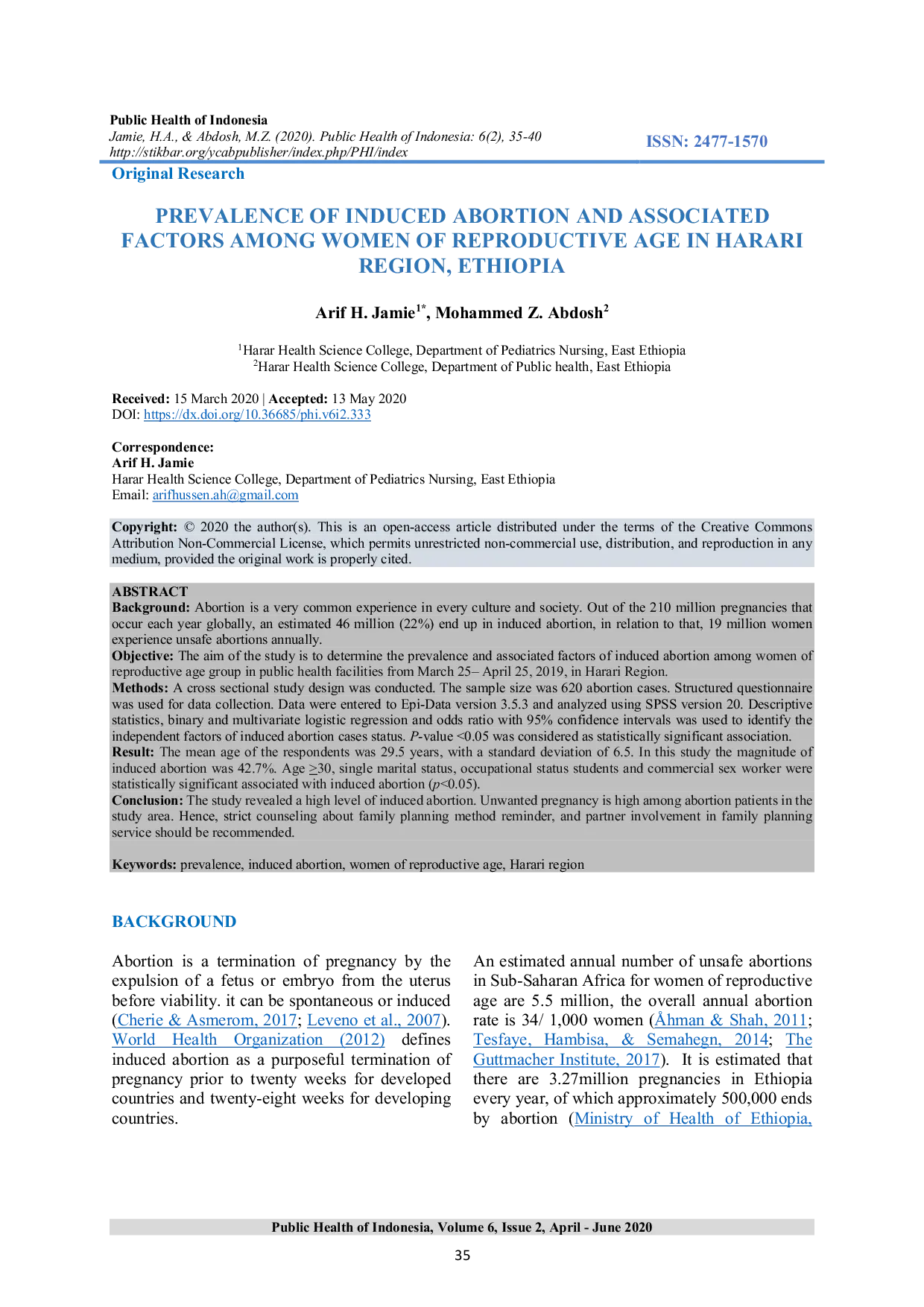 Public Health of IndonesiaPublic Health of IndonesiaAborsi merupakan pengalaman umum di setiap budaya dan masyarakat. Dari 210 juta kehamilan yang terjadi setiap tahun secara global, diperkirakan 46 juta (22%) berakhir dengan aborsi induksi, terkait dengan hal tersebut, 19 juta wanita mengalami aborsi tidak aman setiap tahunnya. Penelitian ini bertujuan untuk menentukan prevalensi dan faktor-faktor terkait aborsi induksi di kalangan wanita usia reproduksi di fasilitas kesehatan masyarakat dari 25 Maret–25 April 2019, di Wilayah Harari. Hasil penelitian menunjukkan bahwa prevalensi aborsi induksi adalah 42,7%. Usia >30 tahun, status perkawinan lajang, status pekerjaan pelajar, dan pekerja seks komersial secara signifikan berhubungan dengan aborsi induksi (p<0,05). Penelitian ini mengungkapkan tingkat aborsi induksi yang tinggi. Kehamilan yang tidak diinginkan tinggi di antara pasien aborsi di wilayah penelitian. Oleh karena itu, disarankan untuk memberikan konseling yang ketat tentang pengingat metode perencanaan keluarga, dan keterlibatan pasangan dalam layanan perencanaan keluarga.