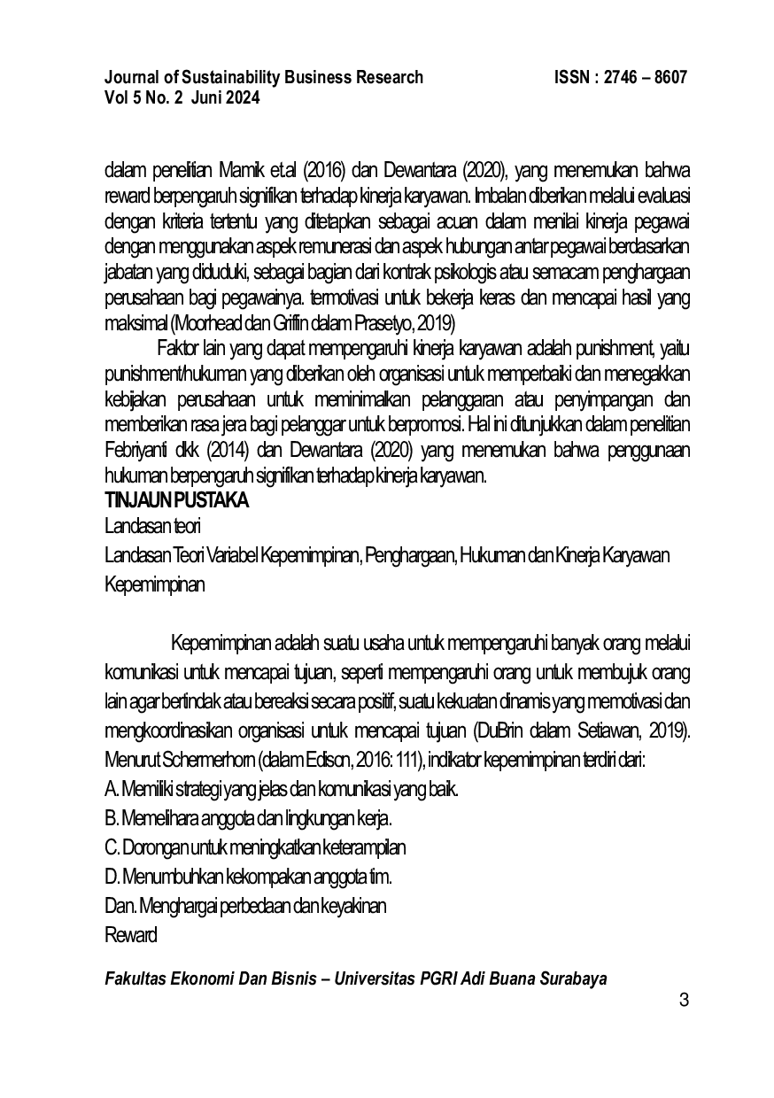 Journal of Sustainability Bussiness Research (JSBR)Journal of Sustainability Bussiness Research (JSBR)This research aims to analyze the influence of reward and punishment leadership on the performance of PT Karya Manunggal Jati employees. Using the data collection method by determining the random sampling and the number of established samples, all the employees who are active are as many as 55 people. The results of the study prove that the influence of leadership on employee performance has a t-count of 6.442 and significant values (0.00) and 0.00 < 0.05, the effect of rewards on employee performance has a t-count of 1722 with a significance value of 0.00 (0.01 < 0.05). while the effect of punishment on employee performance has a t-count of 7.364 with a significant value of 0.00 (0.00 < 0 ,05). Thus, it is argued that leadership with reward and punishment can partially influence the performance of employees. The results of the F-test are known as Sig. 0.000 < 0.05 so it is argued that the factors leadership, reward and punishment influence the performance of employees in PT. Karya Manunggal Jati works simultaneously.