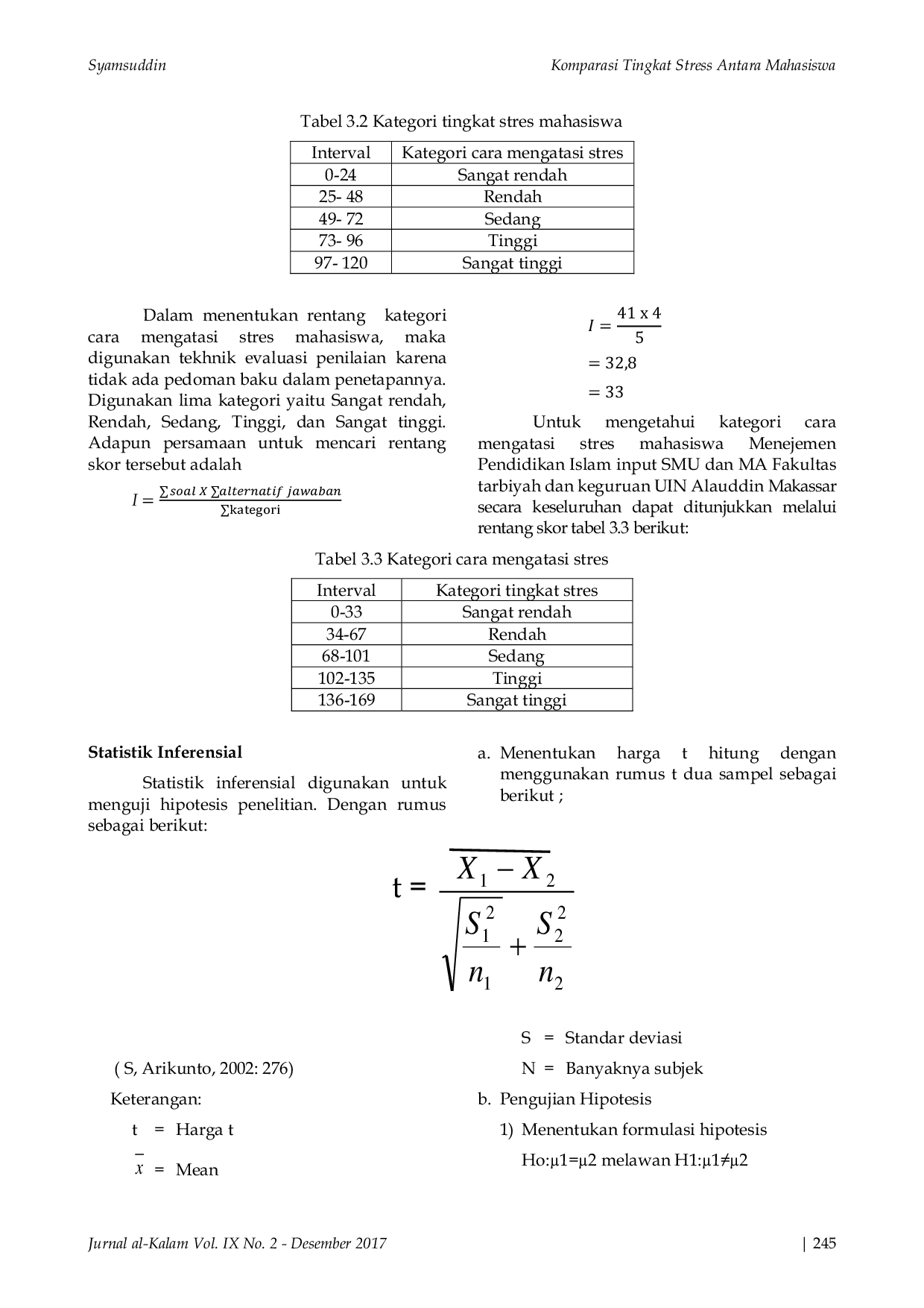 Al-KalamAl-KalamTujuan penelitian ini adalah untuk mengetahui gambaran tentang tingkat stress mahasiswa dalam perkuliahan antara input SMA dan mahasiswa input MA, selain itu juga bertujuan untuk mengetahui perbedaan tingkat stress dalam perkuliahan antara mahasiswa input SMA dan mahasiswa input MA. Sampel dalam penelitian ini berjumlah 50 mahasiswa yang diambil melalui Proportional Stratified Random Sampling. Instrumen pengumpulan data menggunakan angket dengan skala likert yang meliputi skala tingkat stress mahasiswa. Teknik analisis data menggunakan analisis deskriptif dan analisis inferensial yaitu analisis komparasi bivariat dengan uji statistik test “t. Berdasarkan hasil analisis data dengan menggunakan statistik deskriptif untuk tingkat stress mahasiswa input SMA diperoleh rata-rata 27,196 dengan kategori rendah dengan presentase 67,67%, dan tingkat stress mahasiswa input MA diperoleh rata-rata 30,03 dengan kategori rendah dengan presentase 81,5%. Adapun statistik inferensial menyatakan terdapat perbedaan yang signifikan tingkat stress antara mahasiswa input MA dan mahasiswa input SMA yaitu thitung < ttabel untuk taraf signifikan 5% maupun 1% (-1,96 > -5,183 < -1,96).