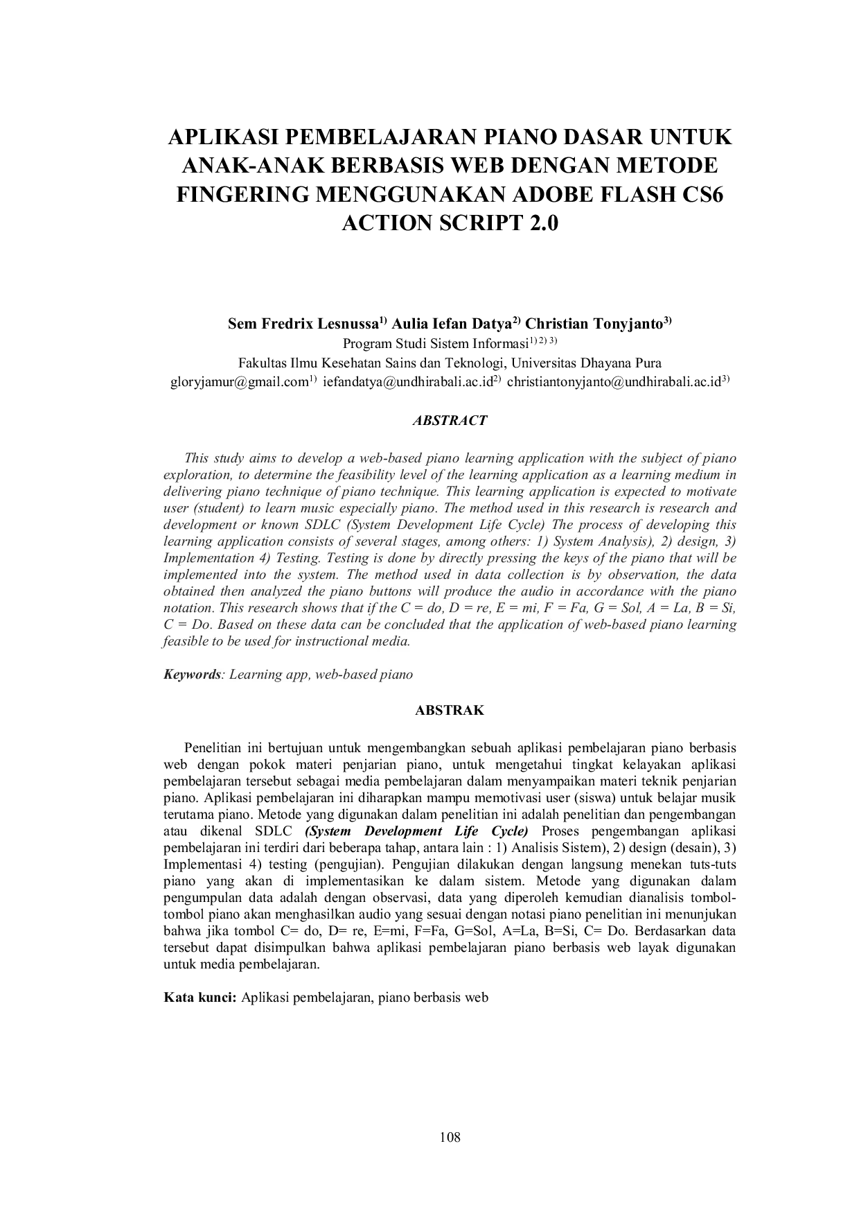 Jurnal Teknologi Informasi dan KomputerJurnal Teknologi Informasi dan KomputerPenelitian ini bertujuan untuk mengembangkan sebuah aplikasi pembelajaran piano berbasis web dengan pokok materi penjarian piano, untuk mengetahui tingkat kelayakan aplikasi pembelajaran tersebut sebagai media pembelajaran dalam menyampaikan materi teknik penjarian piano. Aplikasi pembelajaran ini diharapkan mampu memotivasi user (siswa) untuk belajar musik terutama piano. Metode yang digunakan dalam penelitian ini adalah penelitian dan pengembangan atau dikenal SDLC (System Development Life Cycle) Proses pengembangan aplikasi pembelajaran ini terdiri dari beberapa tahap, antara lain : 1) Analisis Sistem), 2) desain, 3) Implementasi 4) testing (pengujian). Pengujian dilakukan dengan langsung menekan tuts-tuts piano yang akan di implementasikan ke dalam sistem. Metode yang digunakan dalam pengumpulan data adalah dengan observasi, data yang diperoleh kemudian dianalisis tombol-tombol piano akan menghasilkan audio yang sesuai dengan notasi piano penelitian ini menunjukan bahwa jika tombol C= do, D= re, E=mi, F=Fa, G=Sol, A=La, B=Si, C= Do. Berdasarkan data tersebut dapat disimpulkan bahwa aplikasi pembelajaran piano berbasis web layak digunakan untuk media pembelajaran.