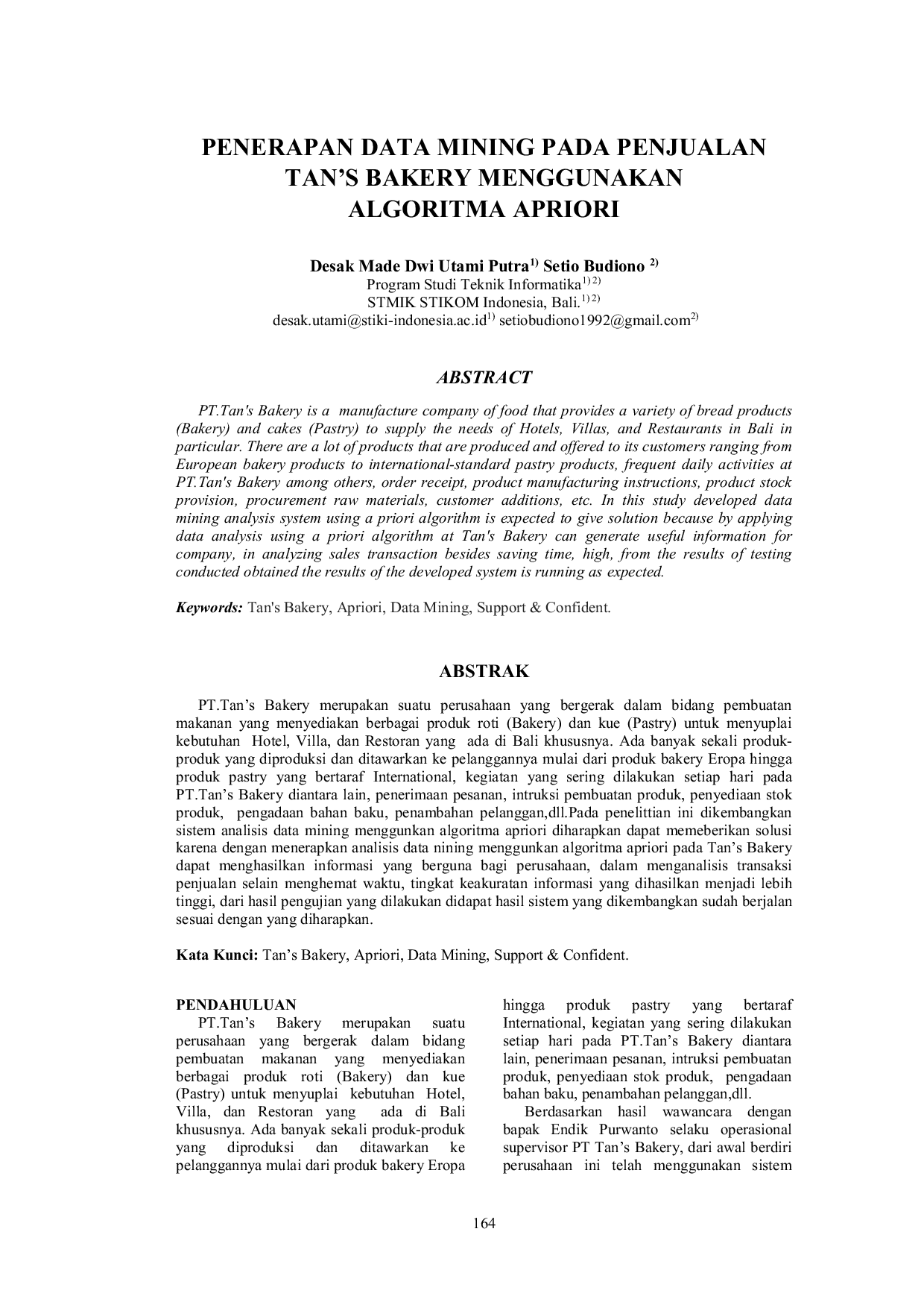 Jurnal Teknologi Informasi dan KomputerJurnal Teknologi Informasi dan KomputerPT. Tans Bakery adalah perusahaan yang bergerak dalam bidang pembuatan makanan yang menyediakan berbagai produk roti (Bakery) dan kue (Pastry) untuk menyuplai kebutuhan Hotel, Villa, dan Restoran di Bali khususnya. Ada banyak produk yang diproduksi dan ditawarkan kepada pelanggan, mulai dari produk bakery Eropa hingga produk pastry yang bertaraf International. Penelitian ini mengembangkan sistem analisis data mining menggunakan algoritma Apriori yang diharapkan dapat memberikan solusi karena dengan menerapkan analisis data menggunakan algoritma Apriori pada Tans Bakery dapat menghasilkan informasi yang berguna bagi perusahaan dalam menganalisis transaksi penjualan, selain menghemat waktu, tingkat keakuratan informasi yang dihasilkan menjadi lebih tinggi. Dari hasil pengujian yang dilakukan, didapatkan hasil bahwa sistem yang dikembangkan sudah berjalan sesuai dengan yang diharapkan.