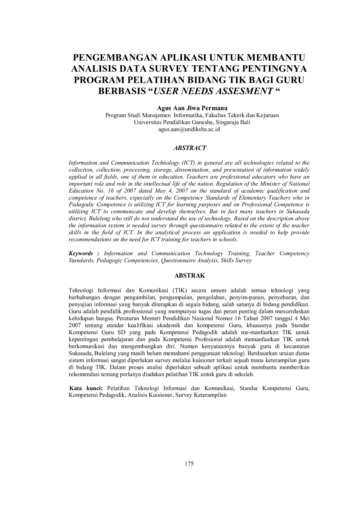 Jurnal Teknologi Informasi dan KomputerJurnal Teknologi Informasi dan KomputerTeknologi Informasi dan Komunikasi (TIK) secara umum adalah semua teknologi yang berhubungan dengan pengambilan, pengumpulan, pengolahan, penyim-panan, penyebaran, dan penyajian informasi yang banyak diterapkan di segala bidang, salah satunya di bidang pendidikan. Guru adalah pendidik professional yang mempunyai tugas dan peran penting dalam mencerdaskan kehidupan bangsa. Peraturan Menteri Pendidikan Nasional Nomor 16 Tahun 2007 tanggal 4 Mei 2007 tentang standar kualifikasi akademik dan kompetensi Guru, khususnya pada Standar Kompetensi Guru SD yang pada Kompetensi Pedagodik adalah me-manfaatkan TIK untuk kepentingan pembelajaran dan pada Kompetensi Profesional adalah memanfaatkan TIK untuk berkomunikasi dan mengembangkan diri. Namun kenyataannya banyak guru di kecamatan Sukasada, Buleleng yang masih belum memahami penggunaan teknologi. Berdasarkan uraian diatas sistem informasi sangat diperlukan survey melalui kuisioner terkait sejauh mana keterampilan guru di bidang TIK. Dalam proses analisi diperlukan sebuah aplikasi untuk membantu memberikan rekomendasi tentang perlunya diadakan pelatihan TIK untuk guru di sekolah.
