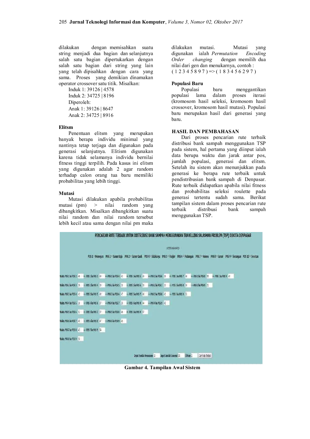 Jurnal Teknologi Informasi dan KomputerJurnal Teknologi Informasi dan KomputerBank sampah adalah suatu tempat yang digunakan mengumpulkan sampah-sampah yang sudah dipilah- pilah. Antusias masyarakat yang tinggi menjadi nasabah bank sampah berbanding terbalik dengan keadaan sebenarnya dimana masih sedikit masyarakat yang menjadi nasabah bank sampah. Hal yang menjadi kendala masyarakat adalah mengumpulkan sampah sendiri dan menyetornya ke pihak pengelola bank sampah. Proses pengumpulan sampah ini haruslah dilakukan secara optimal agar tujuan dari dibentuknya bank sampah dapat tercapai dan pertumbuhan nasabah bank sampah meningkat. Maka untuk mengatasi masalah penjemputan sampah dilakukan pencarian rute terbaik untuk distribusi bank sampah menggunakan Travelling Salasmen Problem (TSP). Metode optimasi untuk penentuan jalur terbaik menggunakan algoritma genetika. Algoritma genetika merupakan metode dengan memanfaatkan variable kecepatan disetiap jalur yang mempengaruhi waktu tempuh disetiap jalan dan memanfaatkan proses seleksi alamiah yang dikenal dengan proses evolusi, proses perkawinan silang atau fungsi crossover, mutasi maupun perbaikan individu. Hasil dari penelitian pencarian rute terbaik distribusi bank sampah menggunakan Travelling Salesman Problem (TSP) menunjukkan rute terbaik yang harus dilalui bank sampah kota Denpasar pada generasi ke 6 dengan waktu tempuh 331 menit.