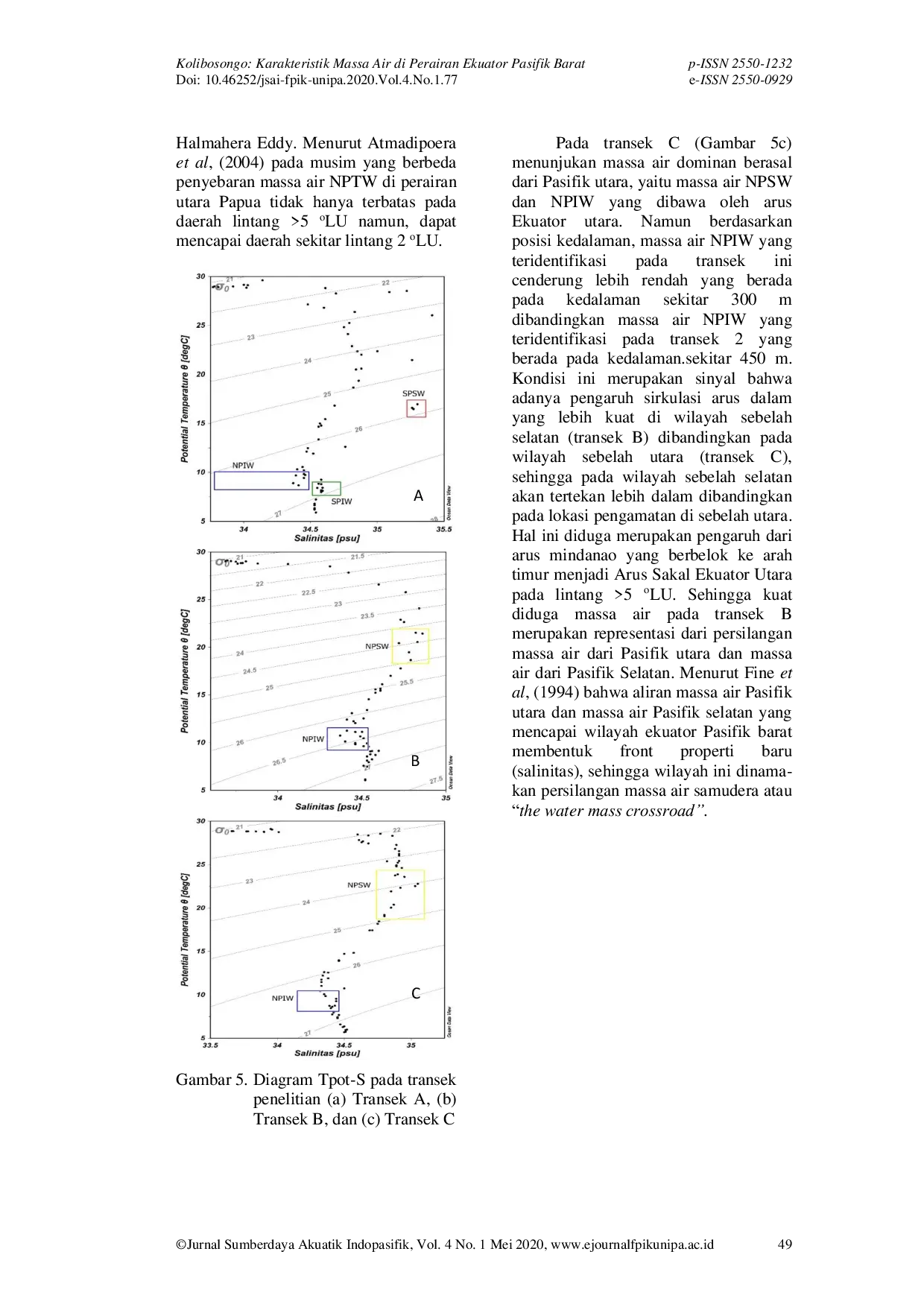 Jurnal Sumberdaya Akuatik IndopasifikJurnal Sumberdaya Akuatik IndopasifikPerairan Ekuator Pasifik Barat merupakan tempat bertemunya massa air yang datang dari belahan bumi Utara dan belahan bumi selatan. Penelitian ini bertujuan mengidentifikasi karakteristik massa air yang terbentuk di perairan ekuator Pasifik barat. Penelitian karakteristik massa air di perairan ekuator Pasifik barat dilakukan menggunakan data reanalysis dari World Ocean Atlas (WOA) bulan Agustus 2018. Terdapat 12 stasiun yang terbagi dalam 3 transek untuk dianalisis dalam kajian ini, yaitu transek 1 dan transek 2 yang membentang utara-selatan dan transek 3 yang membentang barat-timur. Analisis dilakukan dengan metode core layer yang diolah dengan perangkat lunak Ocean Data View (ODV). Hasil penelitian memperlihatkan di perairan ekuator Pasifik barat terjadi pertemuan 2 massa air dari Pasifik utara dan Pasifik selatan. Karakteristik massa air pada lintang <5 oLU dominan dipengaruhi oleh massa air permukaan dan intermediate Pasifik selatan yang dibawa oleh Arus bawah Pantai Papua (New Guinea Coastal Current) yang menyusur pantai utara Papua New Guinea dan masuk ke perairan Papua dan seterusnya ke perairan Laut Halmahera. Sedangkan massa air pada daerah lintang >5 oLU didominasi massa air permukaan dan intermediate dari Pasifik Utara yang dibawa oleh Arus Sakal Ekuator.