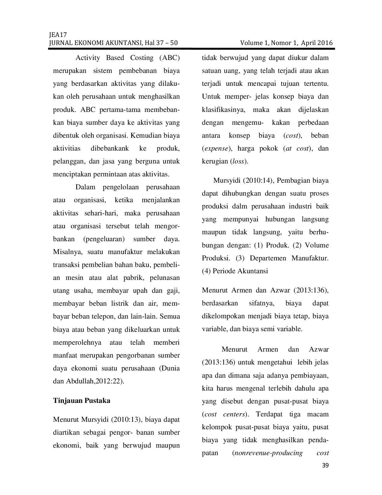 JEA17: Jurnal Ekonomi AkuntansiJEA17: Jurnal Ekonomi AkuntansiPenelitian ini bertujuan untuk mengetahui penerapan metode Activity-Based Costing dalam menentukan tarif jasa rawat inap di Rumah Sakit Husada Utama Surabaya dan membandingkannya dengan tarif yang telah ditetapkan rumah sakit. Metode ABC digunakan untuk mengalokasikan biaya berdasarkan aktivitas-aktivitas dalam memberikan layanan guna menentukan jumlah biaya yang dikeluarkan. Penelitian ini menggunakan metode deskriptif dengan data primer melalui observasi langsung, wawancara, dan pengumpulan data dari objek penelitian. Perhitungan tarif jasa rawat inap dengan metode ABC dilakukan dalam dua tahap: pertama, mengalokasikan biaya ke aktivitas yang menimbulkan biaya, dan kedua, membebankan biaya aktivitas ke produk. Tarif ditentukan dengan menambahkan biaya rawat inap dan laba yang diharapkan. Hasil perhitungan menunjukkan tarif untuk kelas Suite Rp1.434.298, VVIP Rp1.141.516, VIP Rp757.680, Kelas I Rp706.888, Kelas II Rp643.385, dan Kelas III Rp616.269. Metode ABC terbukti mampu mengalokasikan biaya secara lebih tepat sesuai konsumsi masing-masing aktivitas. Berdasarkan asumsi dalam penelitian, disarankan rumah sakit mengurangi tarif kamar kelas Suite, VVIP, dan VIP untuk menarik lebih banyak pasien. Untuk Kelas I, disarankan menaikkan tarif guna mendapatkan laba lebih besar, sedangkan untuk Kelas II dan III disarankan menambah jumlah tempat tidur atau mencapai kapasitas penuh.
