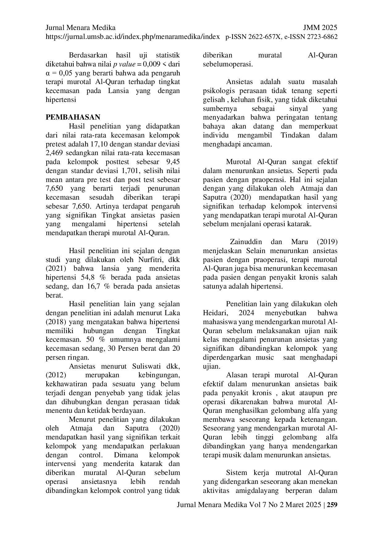 Terapi murotal Al-Quran secara efektif mampu menurunkan tingkat ansietas pada lansia yang menderita hipertensi sebesar 60 persen.Penelitian ini membuktikan adanya pengaruh signifikan terapi murotal Al-Quran dalam mengatasi ansietas pada pasien hipertensi.Diharapkan dengan mendengarkan murotal Al-Quran secara kontinu, tingkat ansietas lansia menurun, sehingga berdampak positif pada kestabilan tekanan darah, pola tidur yang lebih nyenyak, pernapasan teratur, dan denyut nadi yang kembali normal.