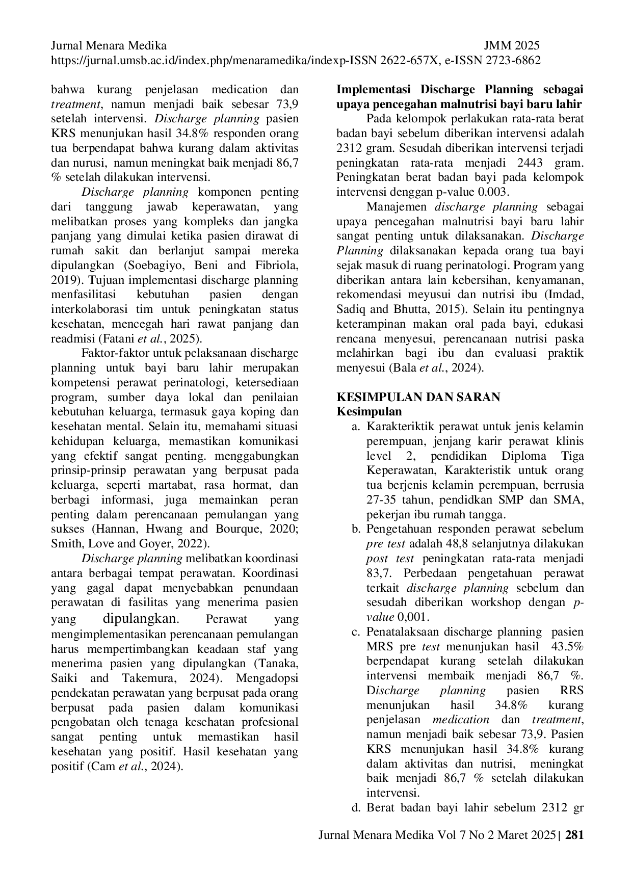 Penelitian ini menyimpulkan bahwa terdapat perbedaan signifikan dalam pengetahuan perawat terkait discharge planning setelah diberikan intervensi berbasis SECI model.Pelaksanaan discharge planning juga menunjukkan peningkatan yang signifikan pada kelompok intervensi.Selain itu, terdapat peningkatan berat badan bayi pada kelompok intervensi dibandingkan kelompok kontrol.Oleh karena itu, discharge planning berbasis knowledge management SECI model efektif dalam mencegah malnutrisi pada bayi baru lahir di rumah sakit.