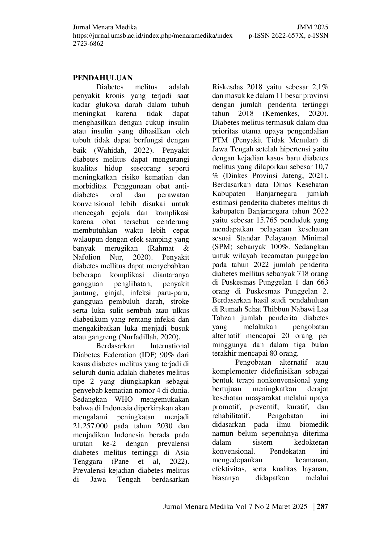 Menara MedikaMenara MedikaLatar Belakang: Diabetes melitus adalah penyakit kronis yang terjadi saat glukosa darah dalam tubuh meningkat. DM tipe 2 menyumbang 90% dari kasus global, WHO memperkirakan 21,2 juta penderita di Indonesia pada 2030, tertinggi kedua di Asia Tenggara. Prevalensi di Jawa Tengah mencapai 2,1% pada 2018, dengan kasus baru 10,7%. Kabupaten Banjarnegara mencatat 15.765 penderita pada 2022, sementara di Kecamatan Punggelan terdapat 1.381 kasus. Penderita diabetes akan melakukan pencarian pengobatan salah satunya menggunakan pengobatan alternatif. Rumah Sehat Thibbun Nabawi Laa Tahzan menangani hingga 80 pasien pengobatan alternatif dalam tiga bulan terakhir. Pemilihan pengobatan alternatif pada pasien diabetes dipengaruhi oleh beberapa faktor. Tujuan: Mengetahui faktor-faktor yang mendasari pemilihan pengobatan alternatif pada pasien diabetes melitus. Metode: Penelitian kuantitatif dengan pendekatan cross sectional, menggunakan teknik purposive sampel. Instrumen menggunakan kuesioner pengetahuan, sikap dan akses. Analisa data univariat, bivariat regresi logistik dan multivariat regresi logistik ganda. Hasil: Hasil penelitian ini menunjukan bahwa faktor pengetahuan dengan hasil p-value 0.183, faktor biaya dan jarak ke pelayanan kesehatan dengan hasil p-value 0.003, faktor sikap dengan hasil p-value 0.058. Kesimpulan: Pengurangan hambatan biaya dan jarak dapat meningkatkan akses atau pemanfaatan layanan kesehatan disamping faktor sikap dan pengetahuan dapat dipertimbangkan sebagai faktor pendukung,.